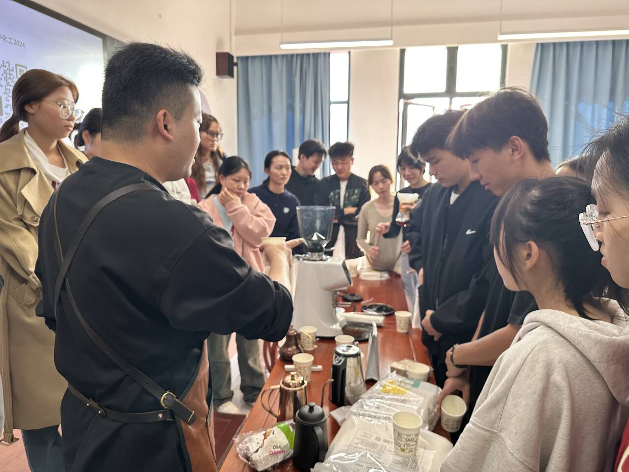理论的作用在于指导实践,在了解了咖啡的基础知识后,吴强老师为同学们展示了手冲咖啡的冲泡流程。从研磨到滤纸叠法,从水温到冲泡手法,吴强老师细致的讲解伴随行云流水般的操作,瞬间激发了同学们的参与热情,大家围在老师身旁,认真观看关键步骤的演示。