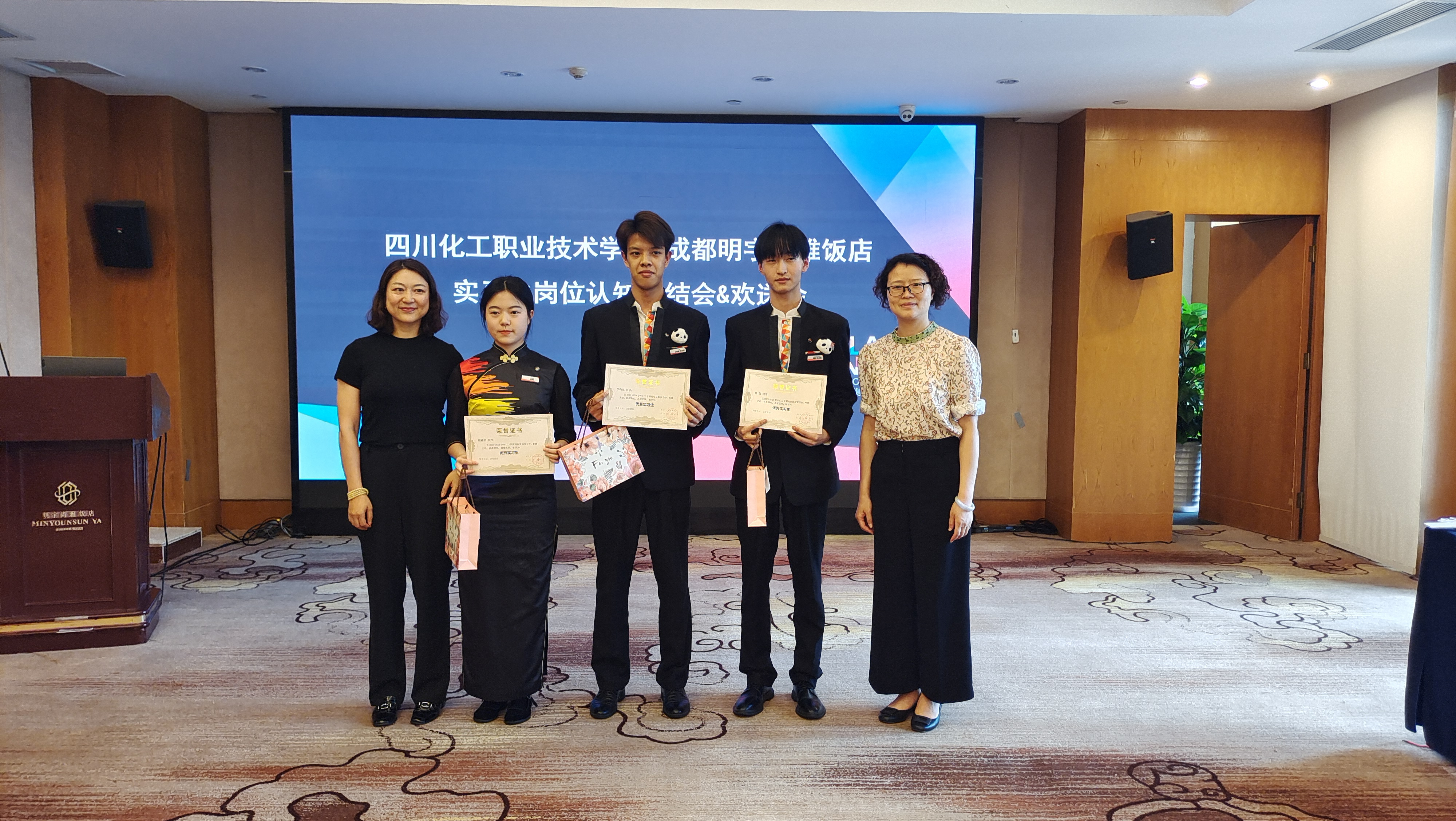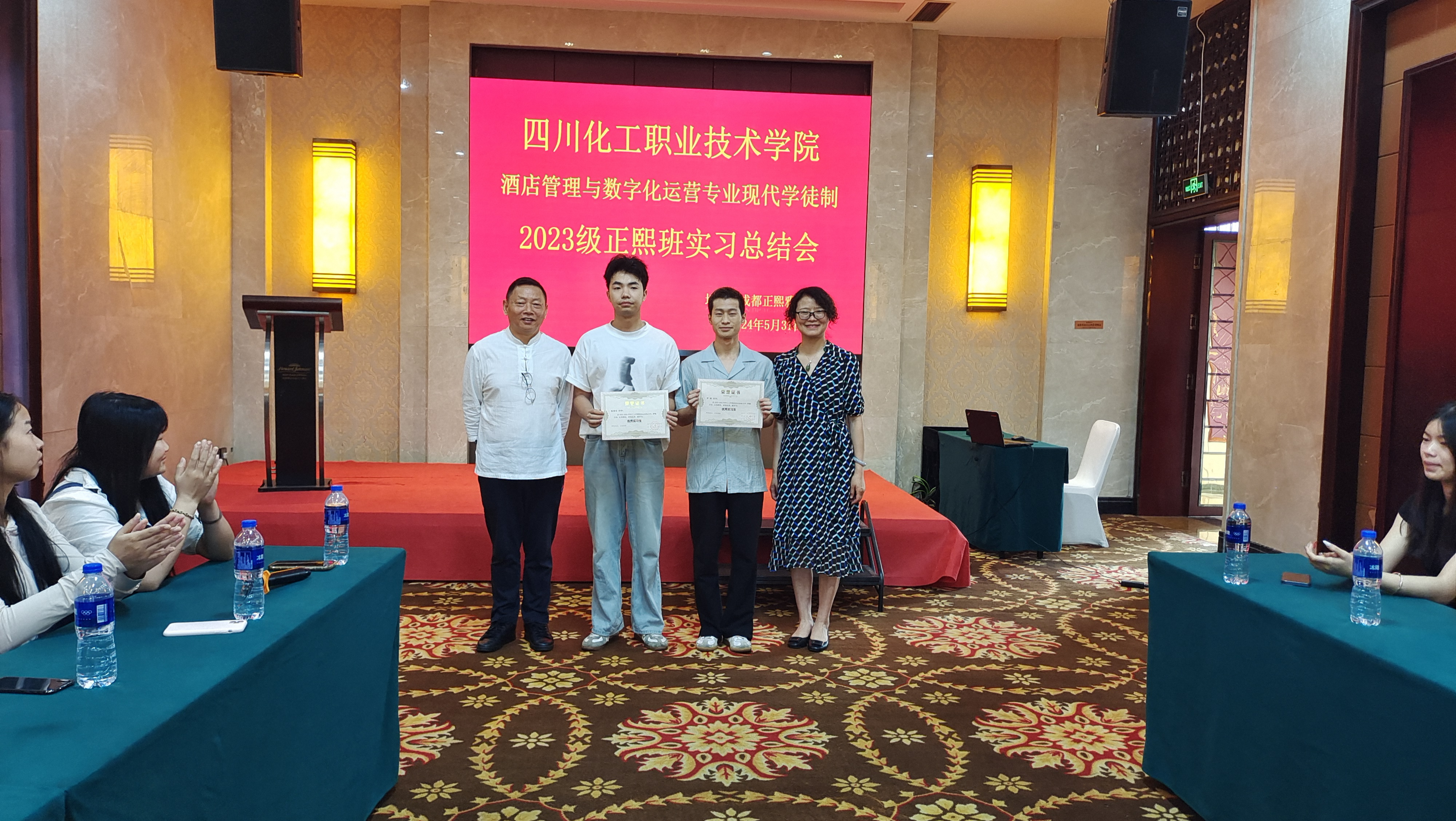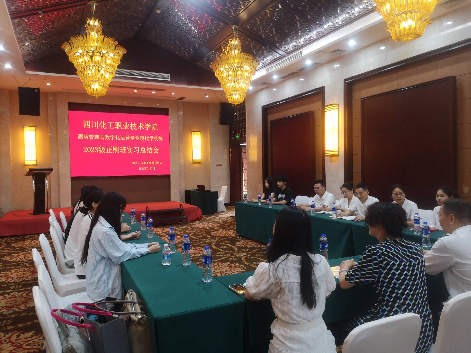 5月30日—31日,酒店管理与数字化运营专业2023级中国特色学徒制岗位认知总结活动分别在成都明宇尚雅酒店、成都正熙雅居酒店开展。经济管理学院党总支书记张晋、酒店管理与数字化运营专业负责人宣雯娟、实习指导教师文斯与酒店各级管理人员一道参加了总结活动。