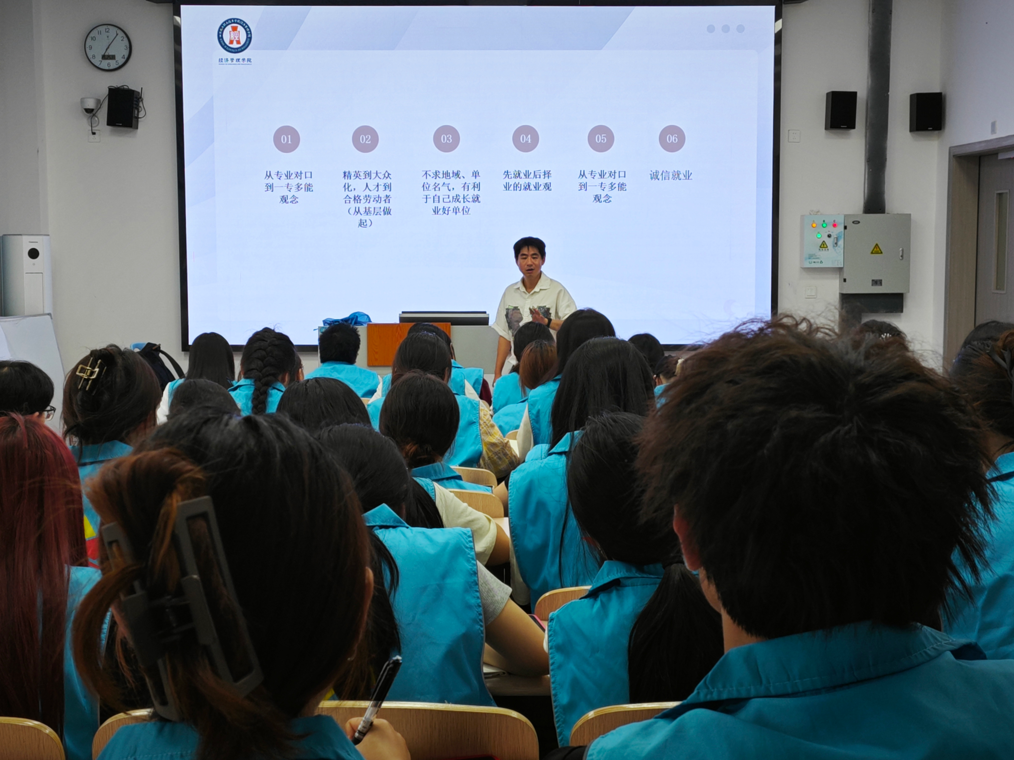 随后,江老师结合大学生关心的就业问题,提出了从“专业对口”到“一专多能”的观念转变。他强调,在就业市场上,单一的专业技能已经不能满足用人单位的需求,学生们需要具备多方面的能力,才能更好地适应市场需求。同时,他也提醒学生们要放下身段,从基层做起,不要过分追求一步到位的工作,而是要在实践中不断学习和成长。