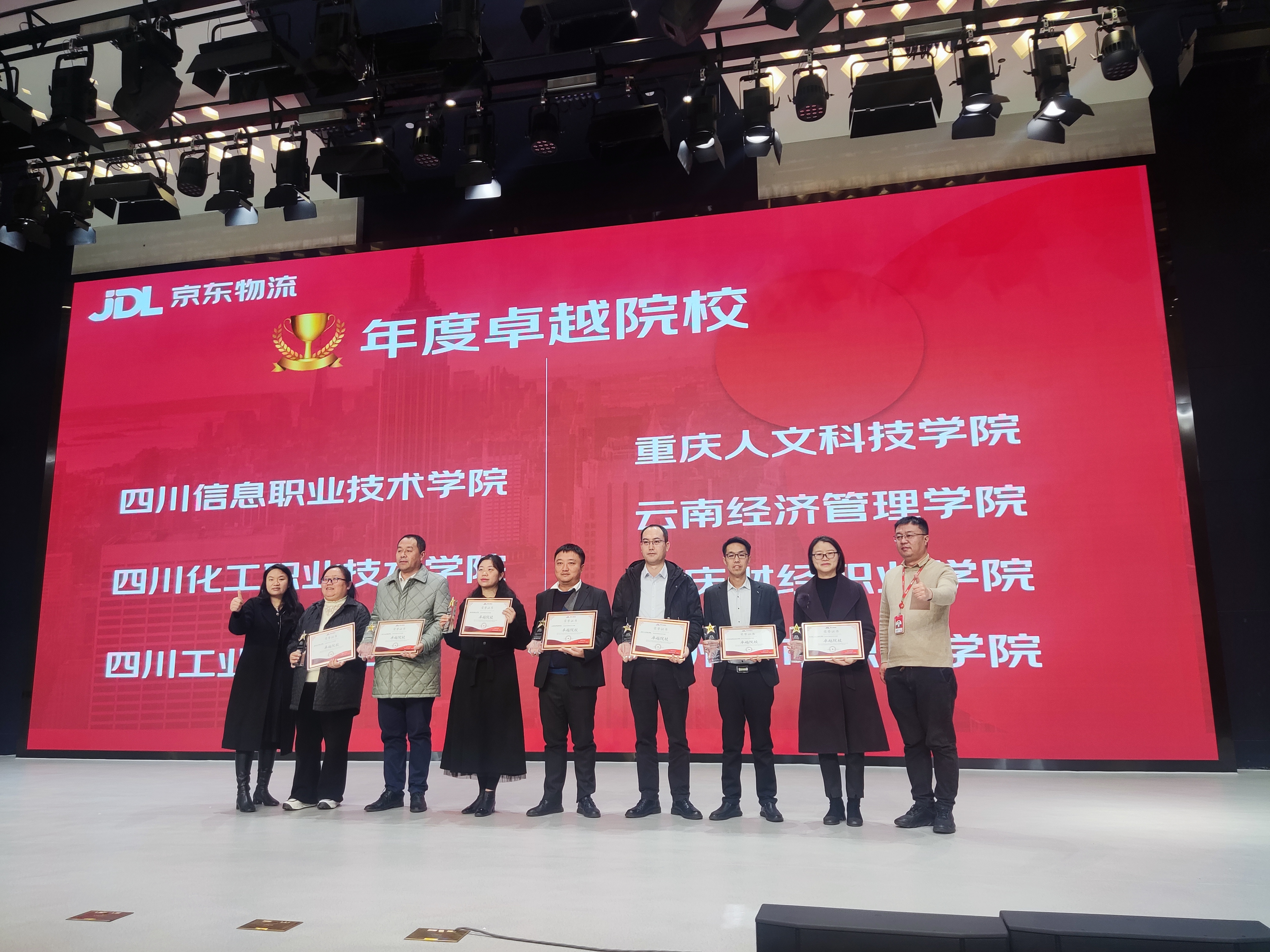 2023年12月15日,“2023年京东物流校企合作表彰大会暨产教融合人才研讨会”在京东西南总部大厦盛大举办,来自西南地区的30余所职业院校参会,在颁奖典礼上,我校荣获“年度卓越院校”称号,经济管理学院党总支书记张晋教授代表学校领取了奖杯。