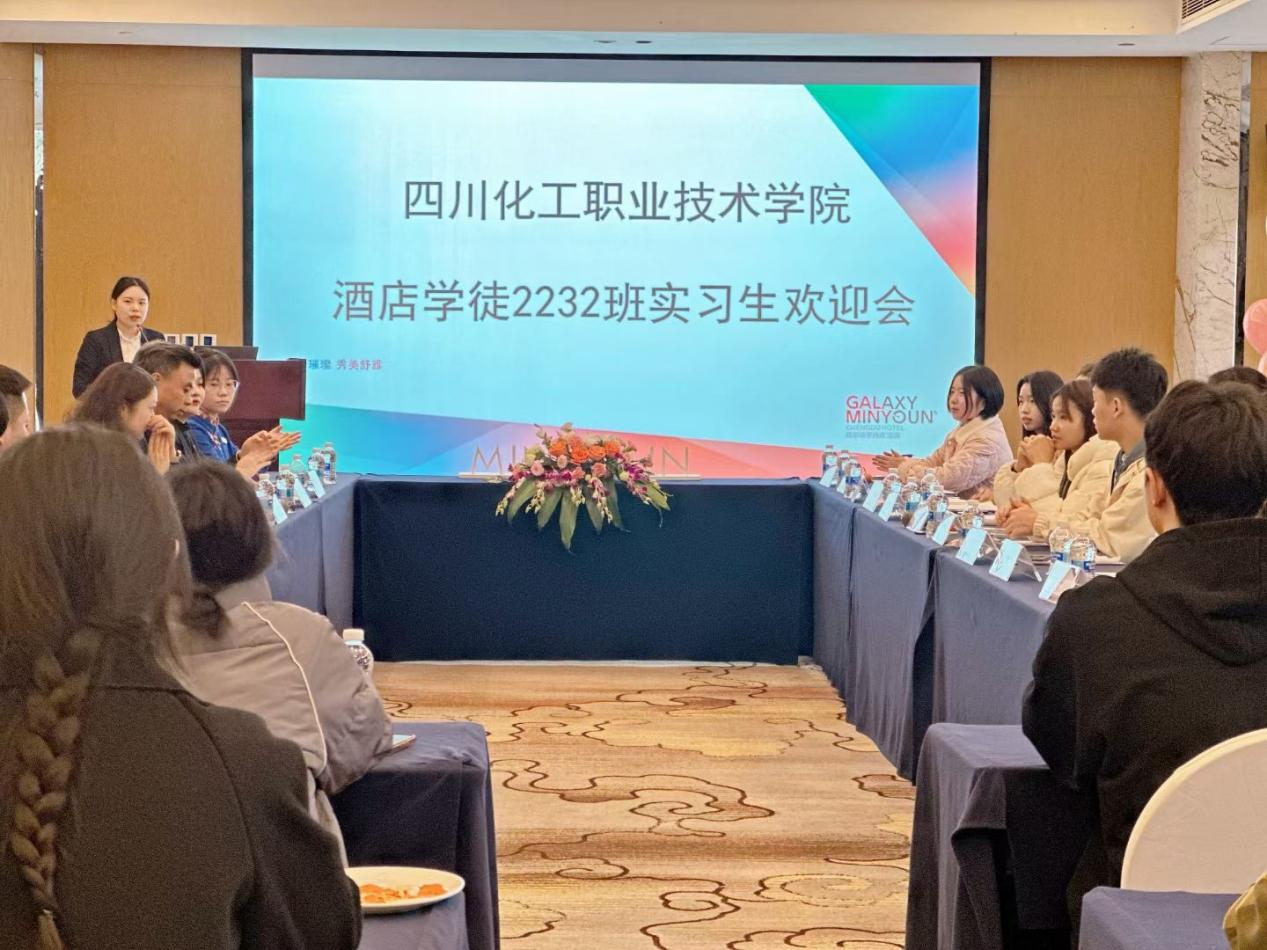 酒店举行了热烈的欢迎仪式,在欢迎仪式上,成都明宇尚雅酒店运营中心总经理雷红莉希望同学们在为期四周的实习中,主动融入,端正态度,多交流多总结,用高标准严格要求自己。成都明宇尚雅酒店综合服务总监彭小勇勉励同学们珍惜机会,虚心请教,努力掌握理论知识和实践技能,不断积累经验。