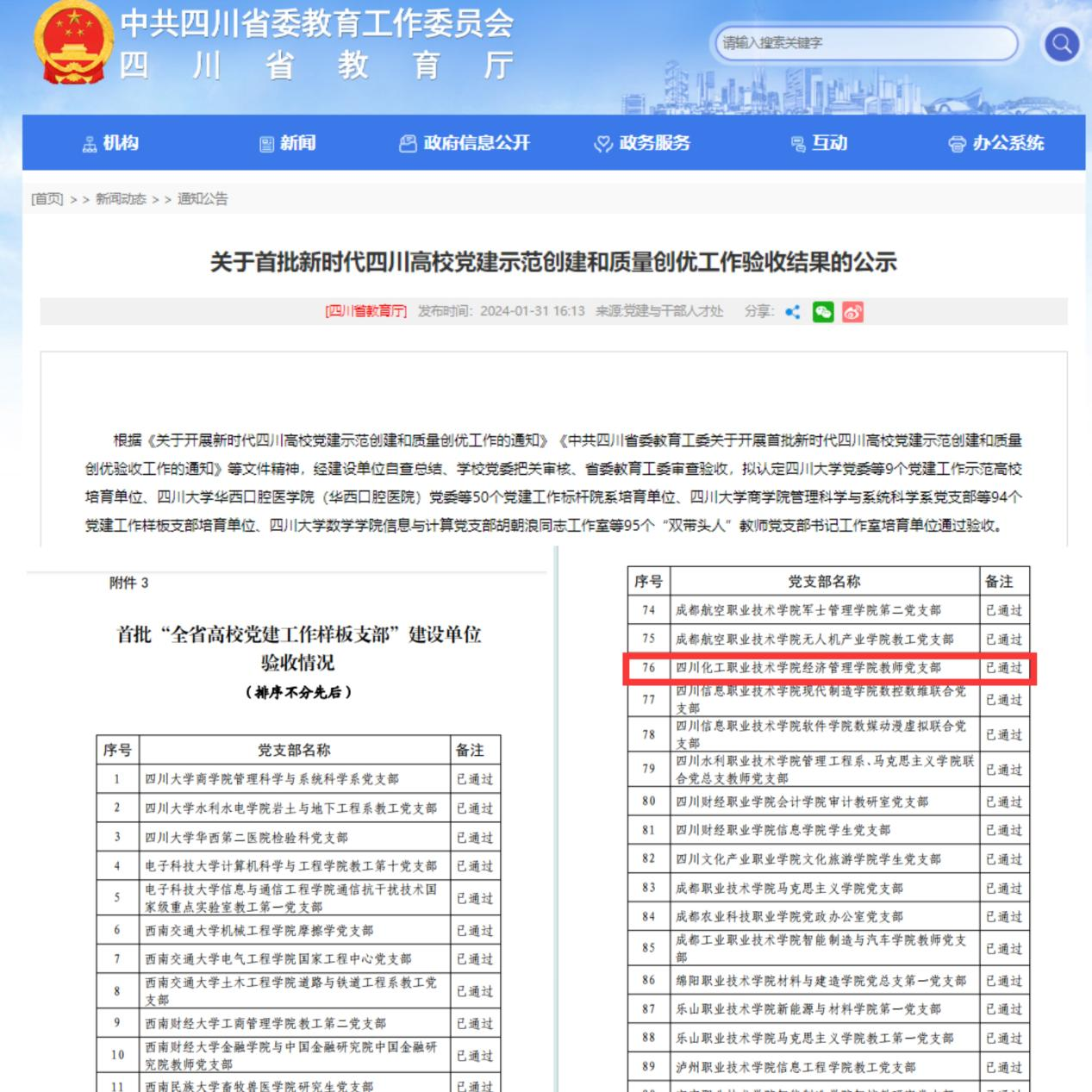 2024年1月31日,四川省委教育工委公布了《关于首批新时代四川高校党建示范创建和质量创优工作验收结果的公示》,四川化工职业技术学院经济管理学院教师党支部顺利通过四川省首批“全省高校党建工作样板支部”建设单位验收。