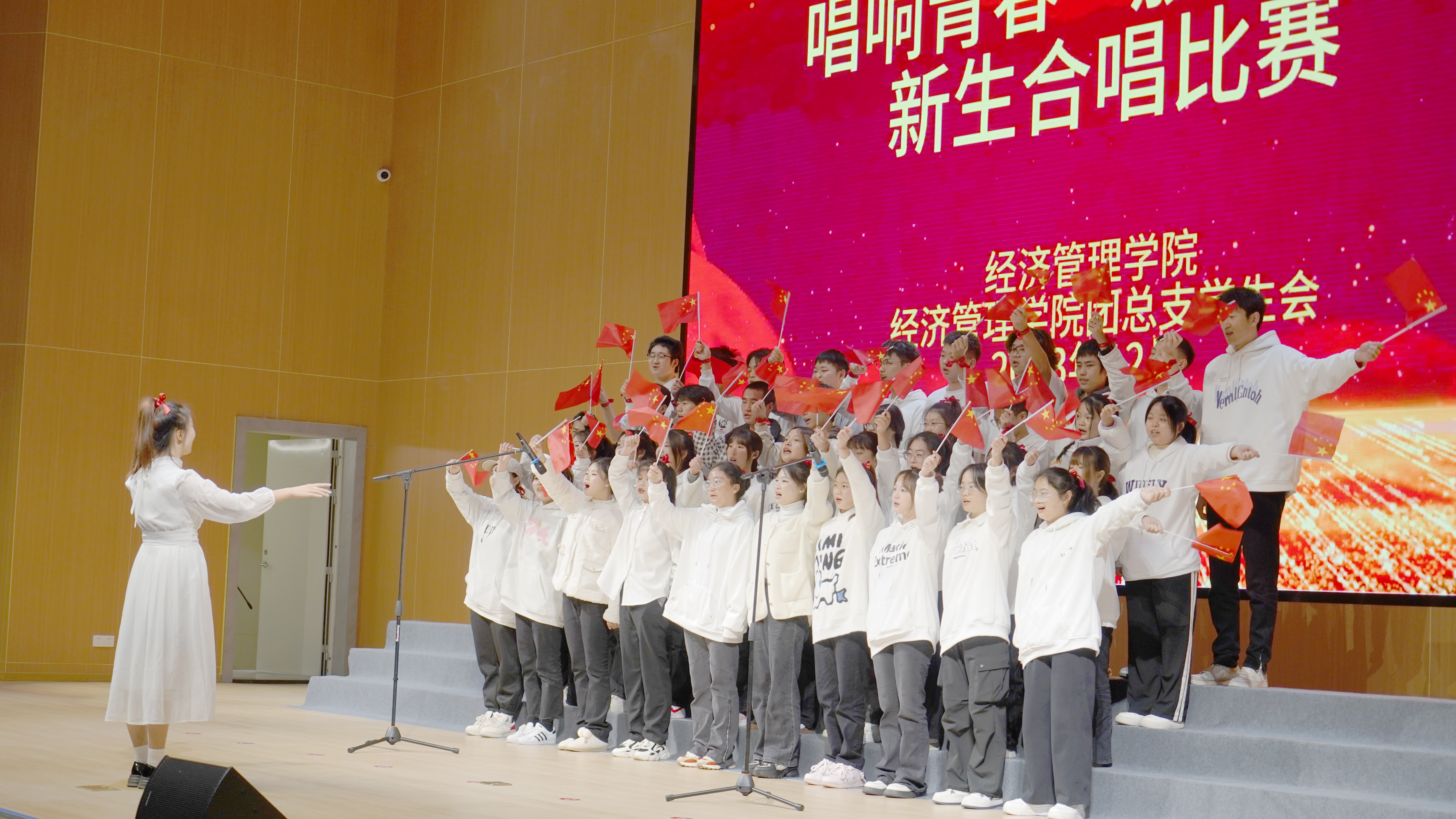随着主持人宣布活动开始,2023级各班井然有序地上场,在指挥的带领下合唱校歌《化作光芒》和各具特色的自选曲目。专注的脸庞折射出内心的自豪,整齐的着装衬托了班级的团结,激昂的歌声里满怀对学院的热爱!