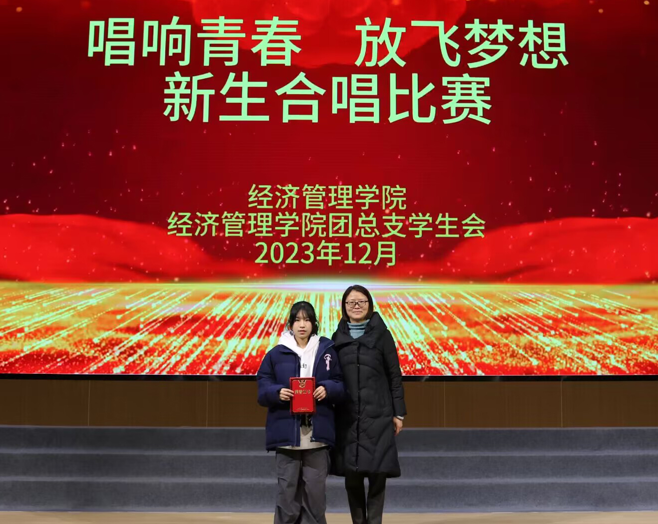 在紧张又令人兴奋的统分环节后,主持人宣布本次新生合唱比赛的最终获奖名单。会计2333班演唱的《化作光芒》+《祖国不会忘记》获得一等奖,会计2332班、会计2321班获得二等奖,酒店2331班、电商2332班和营销2331班获得三等奖,物流2332班、会计2334班、酒店学徒2331班和物流2331班获得优秀奖。