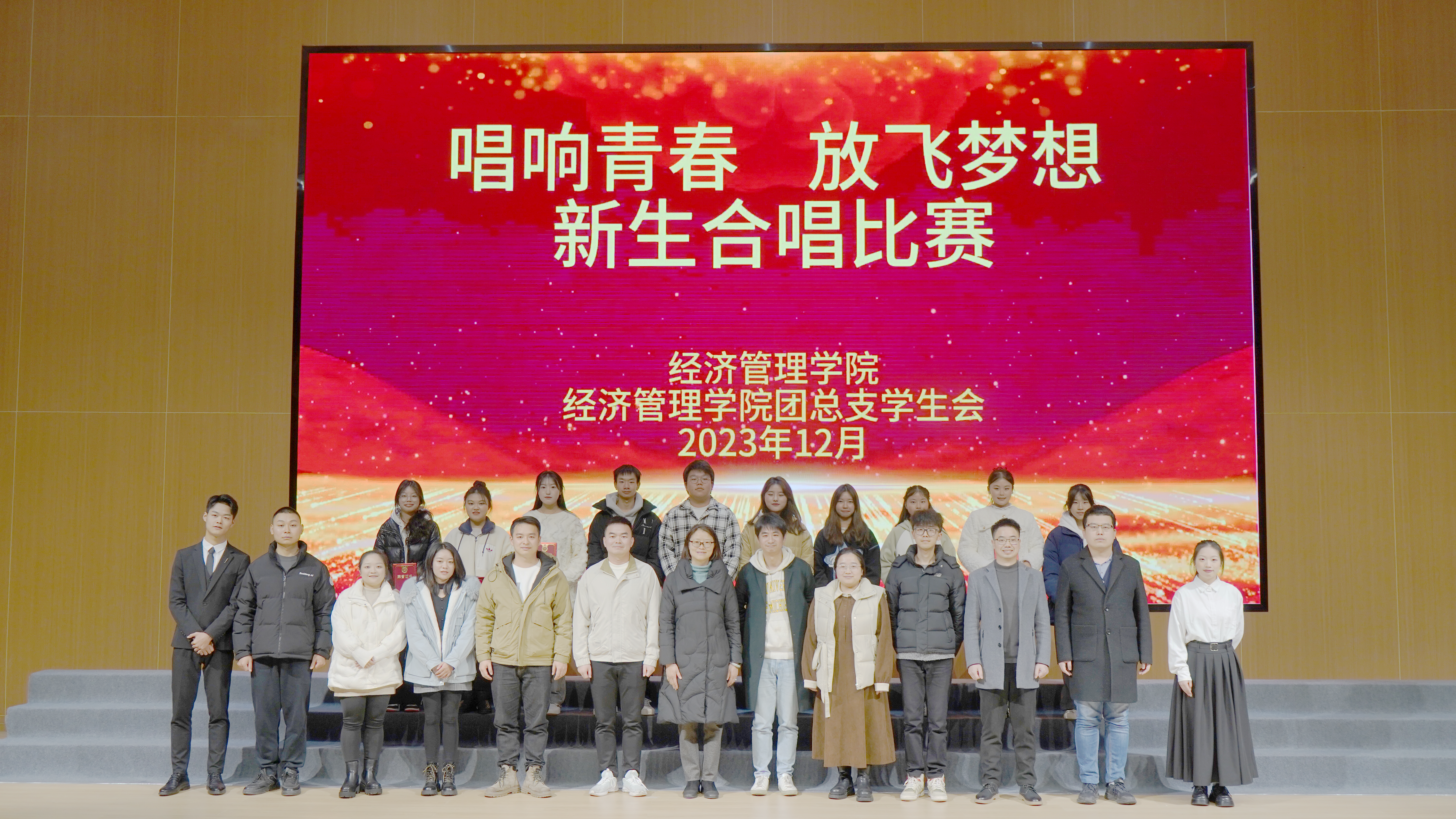 为涵养家国情怀,感召时代脉搏,增强班集体的凝聚力和向心力,展现经管学子的风采。12月2日下午,经济管理学院在酒谷湖校区醇和楼一楼报告厅举办“唱响青春,放飞梦想”新生合唱比赛。学院党总支书记张晋老师、团总支书记李诗诗老师和23级辅导员们出席比赛,比赛评委由学院学生科长江劲、专职辅导员谢耀辉、李蕊君和李付忠老师担任。学院学生刘馥肇、向梦佳主持本次合唱比赛。
