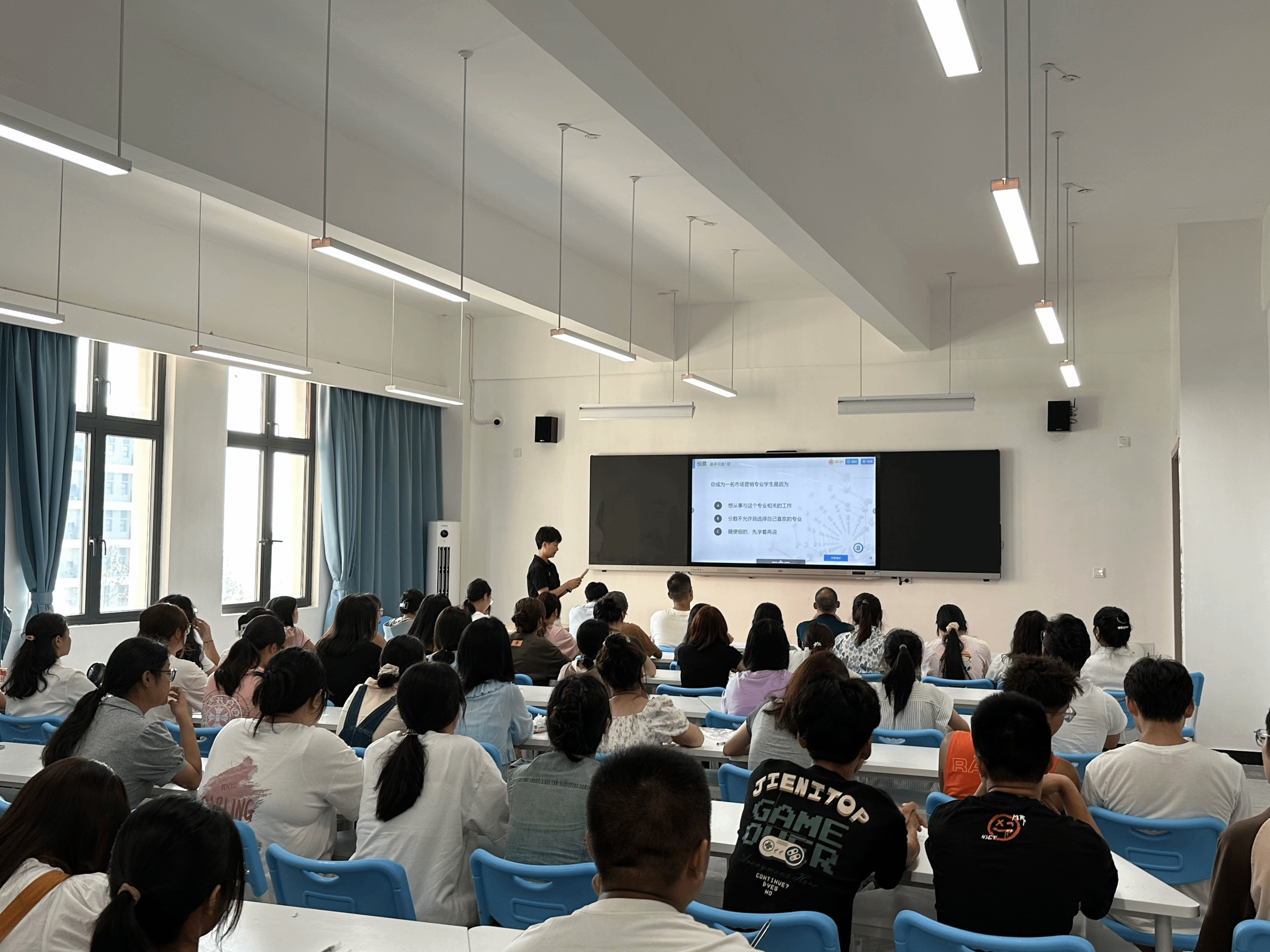本次入学教育中,专业负责人黄戎首先对各位新生选择本专业的原因做了互动调研,了解了大多数同学就读的初衷,然后又对本专业教师团队做了详细的介绍。接下来就本专业的课程设置、专业亮点、就业前景、学习方法与要求等方面对新生们进行了详细介绍。尽管天气十分炎热,同学们都依然热情高涨,聚精会神地聆听老师的一字一句。整个专业教育师生气氛融洽,互动活跃,效果良好。