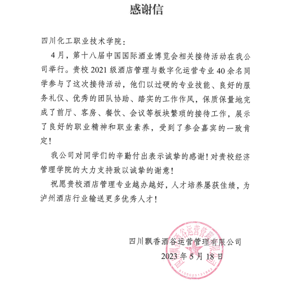 2023年6月2日,经济管理学院收到了一封来自第十八届中国国际酒业博览会的感谢信。信中提到,2021级酒店管理与数字化运营管理专业40余名同学在第十八届中国国际酒业博览会中的突出贡献。无论是从过硬的专业技能,还是良好的服务礼仪或是踏实的工作作风都得到了企业的肯定,得到了参会嘉宾的一致肯定和表扬。