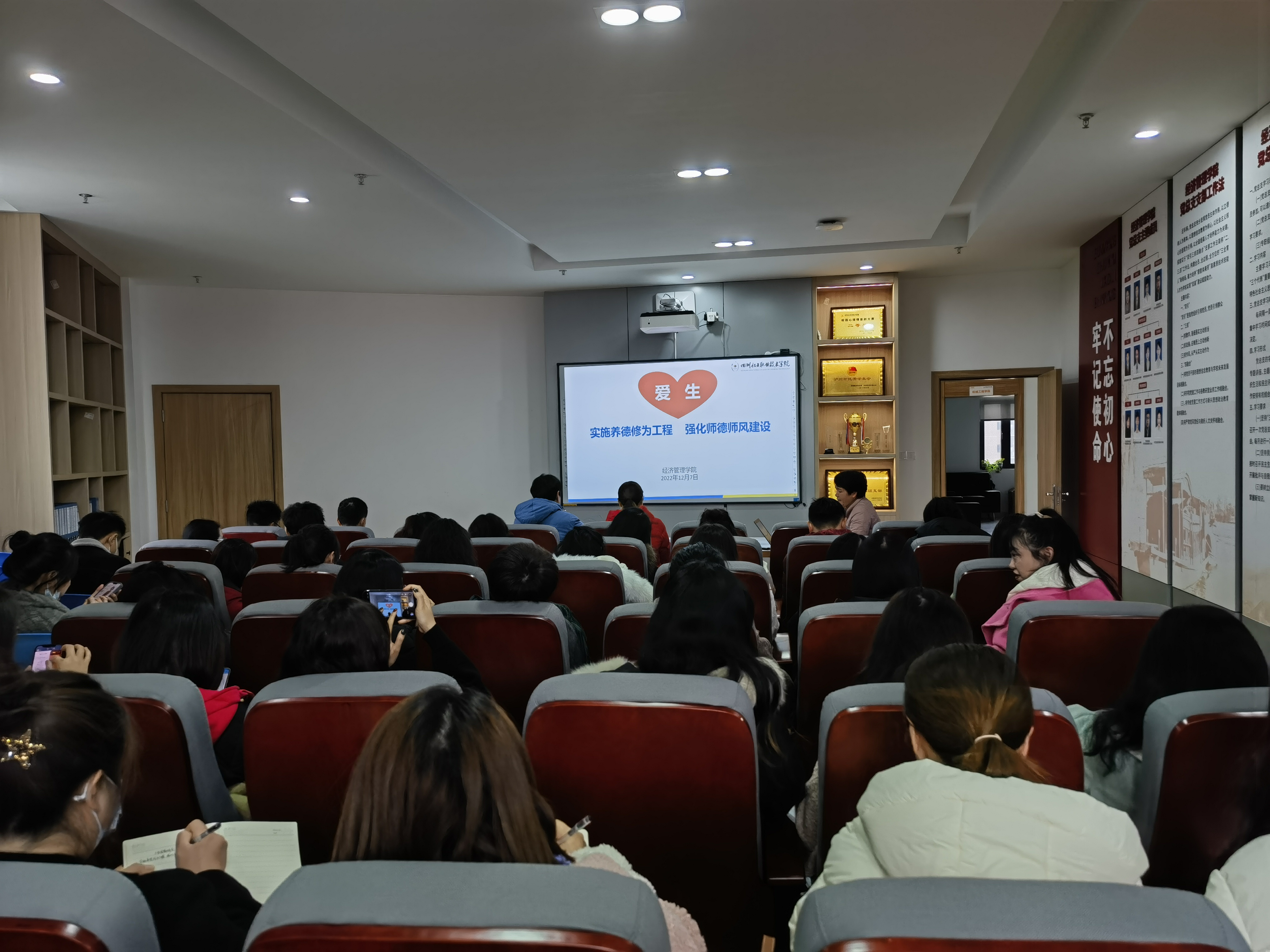 为弘扬“育人为本”的教育理念,落实“立德树人”根本任务,加强经管学院师德修为工程建设,经济管理学院组织全院教职工于2022年12月7日在综合办公楼426会议室开展了以“爱生”为主题的师德师风学习活动。