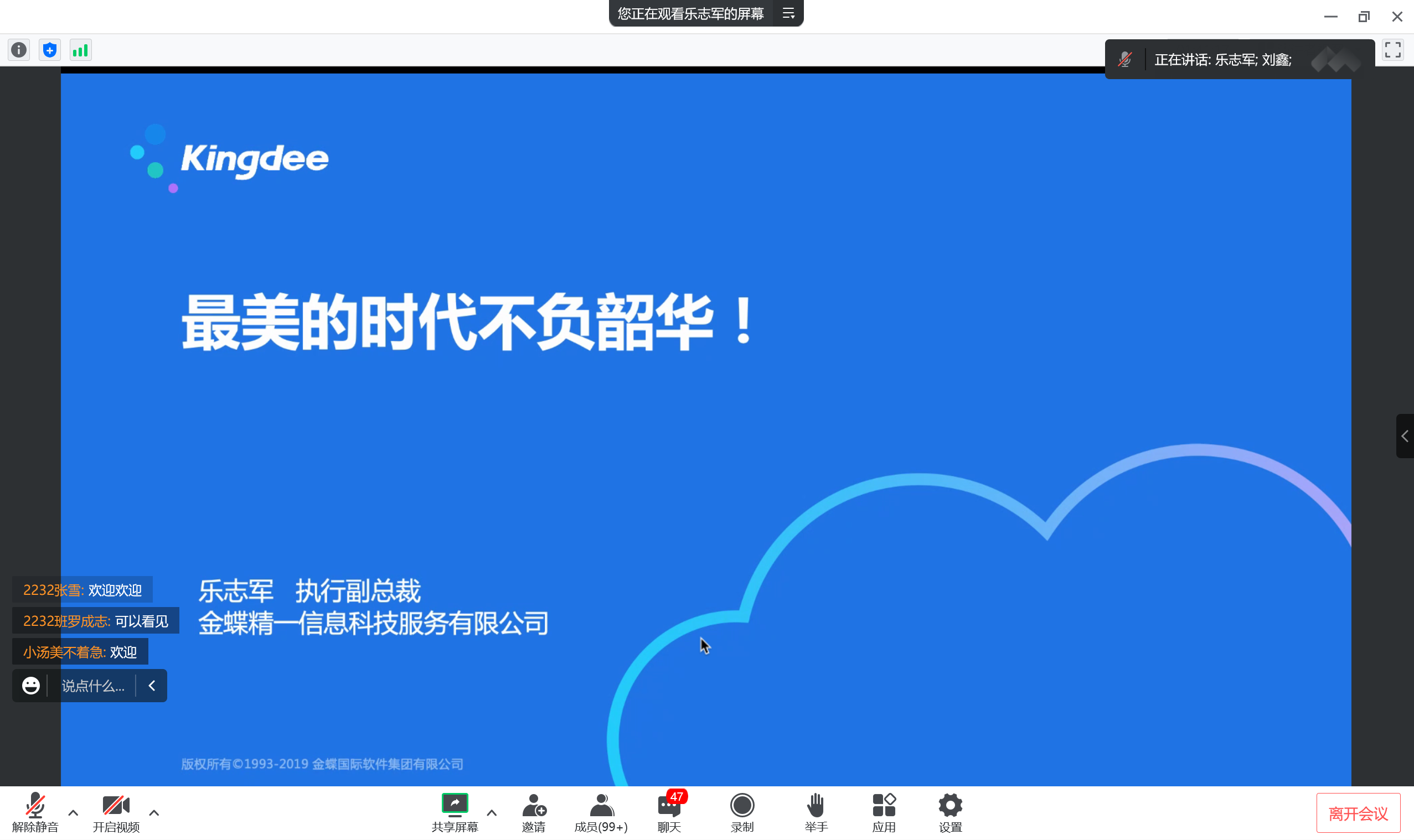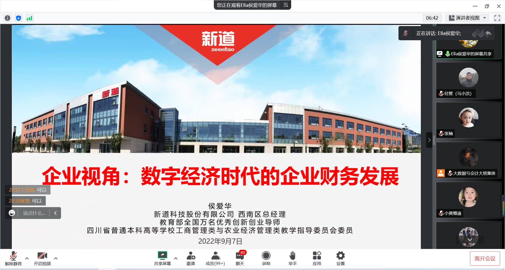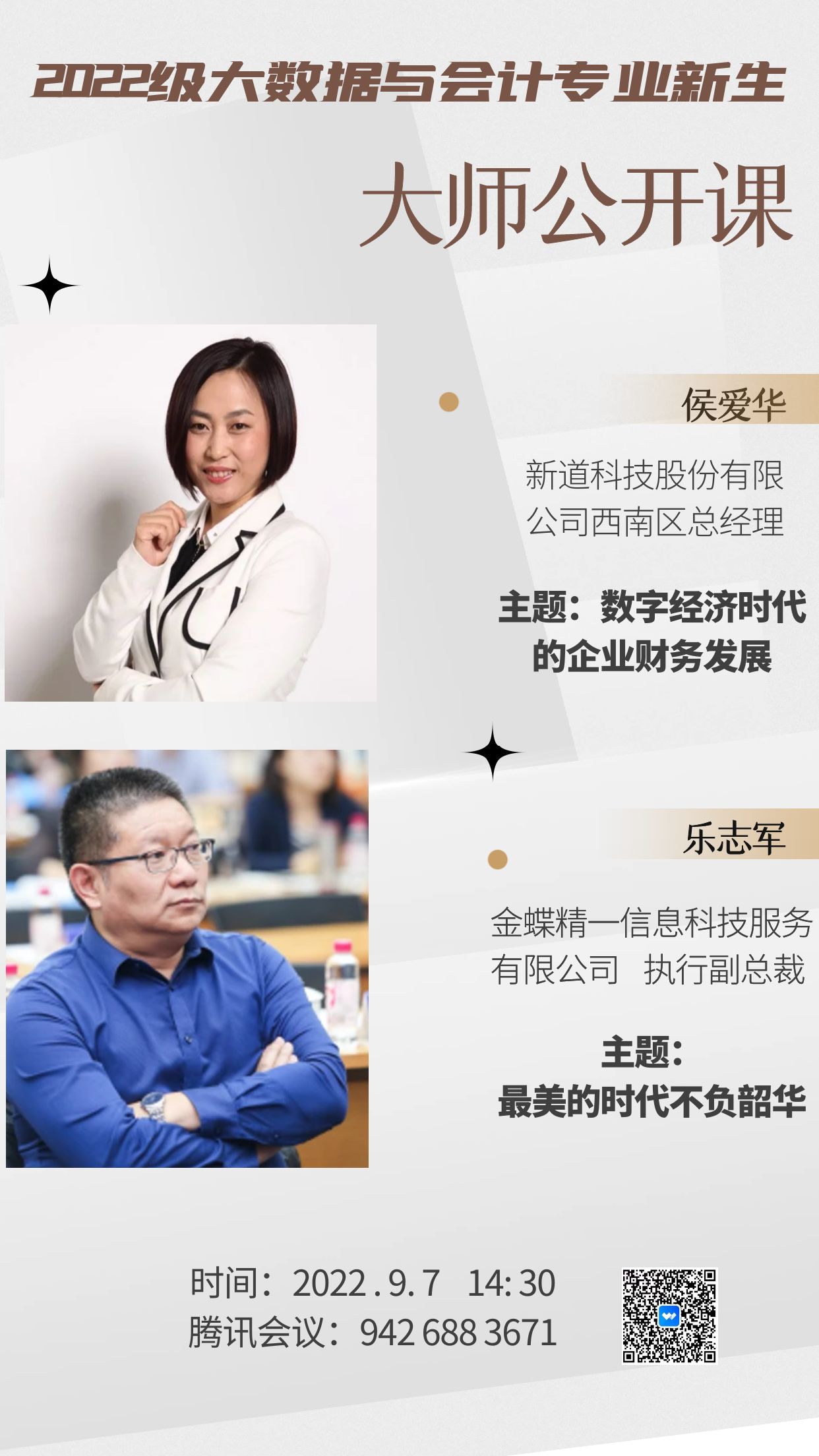 下午是企业大师分享课,特别邀请了校企合作企业新道科技股份有限公司西南区总经理侯爱华女士和金蝶精一信息科技服务有限公司执行副总裁乐志军先生。侯爱华总经理做了《数字经济时代的企业财务发展》为主题的讲座,讲述了财税共享新业态、新模式、新场景、新技术以及大数据时代会计人才的职业成长路径。乐志军副总裁做了《最美时代不负韶华》为主题的讲座,为新生们介绍了新技术下智能财务的发展现状以及学业与个人发展,鼓励同学们成为工管结合的跨界复合型财经人才。同学们在腾讯会议平台聊天区与企业导师积极互动、共同讨论,学习氛围浓厚。