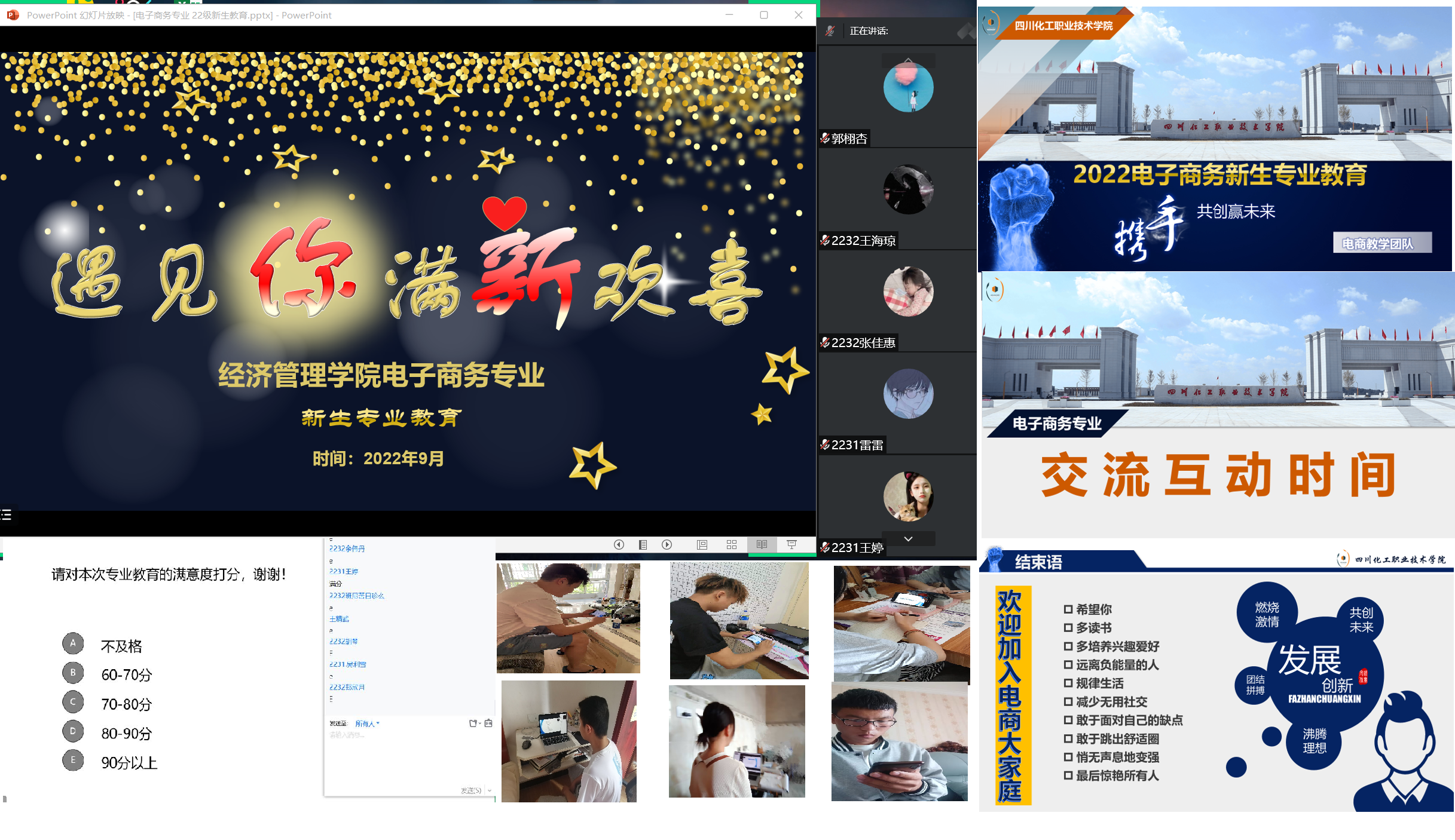 2022年9月6日上午由电子商务专业负责人郭栩杏老师为新生们介绍了学校的概况、专业发展历史、教学团队、课程设置、就业情况等内容,并对同学们的大学新生活进行规划指导,希望同学们在大学里接触广博的知识,培养必要的技能,与老师、同学携手共创未来,绽放自己的光彩。