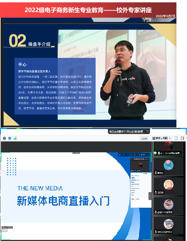 随着2022级新生入学教育工作的推进,经济管理学院电子商务专业教学团队9月5日-7日开展了新生专业教育并邀请企业专家为大家做讲座。电子商务专业带头人经济管理学院马小洪院长,百都集团人力资源中心招聘总监张高航,原字节跳动直播运营负责人,现川叶科技总经理、一诗二画总裁、杭州星诚光速CEO、重庆牧云文化联合创始人朱宇先生,电子商务专业教师团队参与了本次专业入学教育。