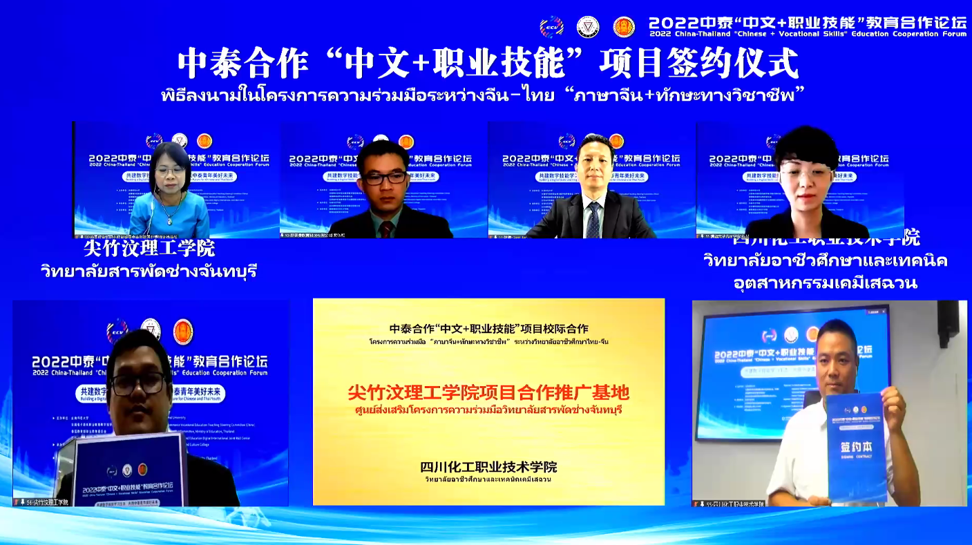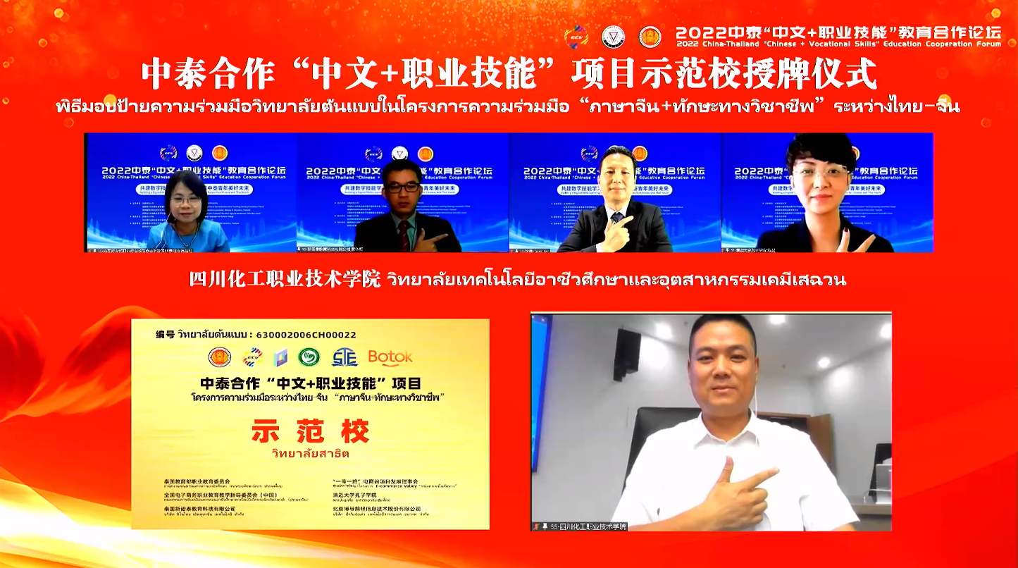 四川化工职业技术学院获得中泰合作“中文+职业技能”项目示范校授牌,与尖竹汶理工学院“云”签署了中泰合作“中文+职业技能”项目合作谅解备忘录。将以校际合作的方式,围绕标准建设、课程与资源开发、师资培训、职业技能培训与认证、活动交流、学术研究、人才对接等内容,共同参与下一阶段项目的实施和推广工作,高质量的开展国际合作。
