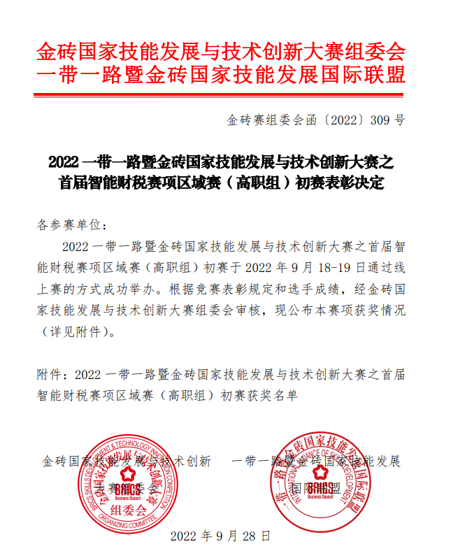 9月30日,2022一带一路暨金砖国家技能发展与技术创新比赛之首届智能财税赛项区域赛圆满完成。经过激烈角逐,经济管理学院大数据与会计专业代表队斩获全国二等奖。