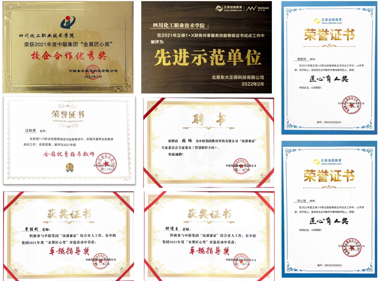 日前,由教育部认定的1+X证书第三方评价机构分别对2021年的证书培训与考核工作进行总结,对在“1+X”证书试点工作中表现优异的院校和指导教师进行表彰。我校荣获“试点工作先进示范单位”、“校企合作优秀奖”等多项荣誉,经济管理学院张楠老师聘为中联集团“岗课赛证”专家委员、新道科技股份有限公司1+X证书课证融通专家,曾胜利老师、钟倩玉老师获得智能财税1+X证书“卓越指导奖”,江秋雯老师获得财务数字化1+X证书“全国优秀指导教师”,曾胜利、刘心怡老师获得财务共享服务1+X证书“匠心育人奖”。