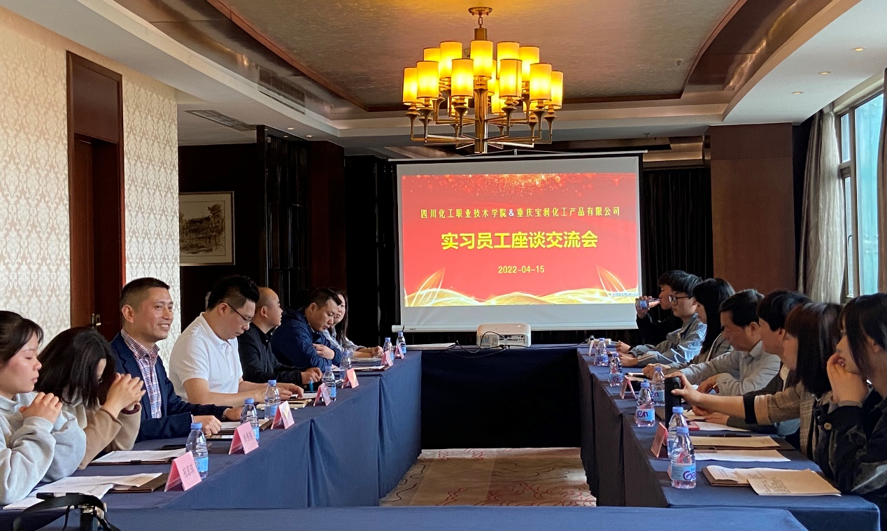 授牌仪式结束后,与我院4名顶岗实习生进行了座谈交流,各实习生汇报了近两个月来的工作、学习和生活情况,畅谈了各自的收获与感受,感恩学校与企业给与的关心与帮助。重庆宝润化工产品有限公司董事长石维胜高度肯定了实习生的优异表现,对于四川化工职业技术学院的育人模式给与高度赞扬。座谈会上,校企双方就实践育人基地的建设和合作模式也作了进一步探讨,王志斌副院长表示,学校应加强了解企业的需要,及时调整专业设置、课程设置和教学内容,切实提高人才培养的针对性和适用性,为企业输送更多优秀的人才。