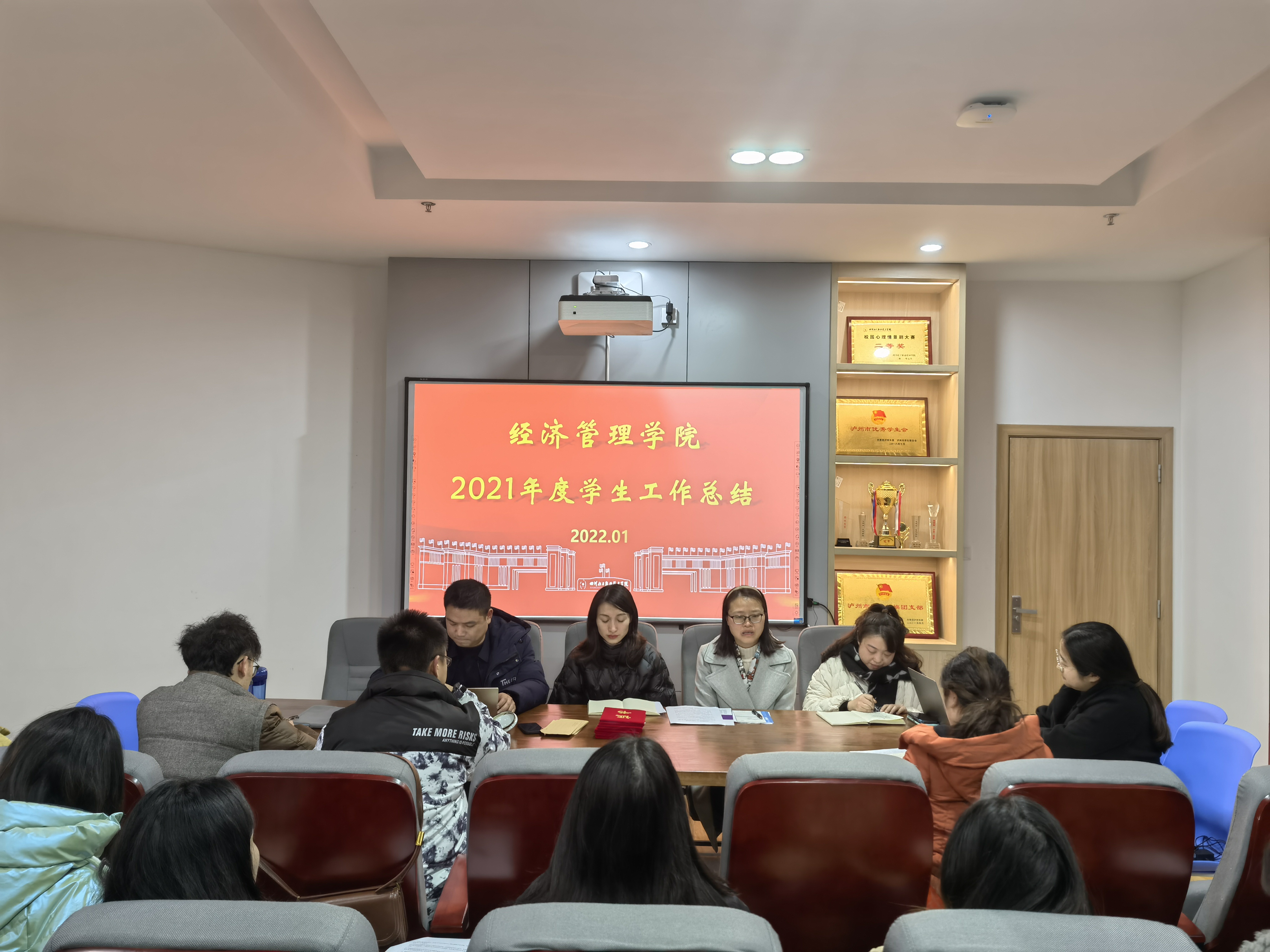 2022年1月12日下午,经济管理学院在综合办公楼426会议室召开2021年度学生工作总结会议。参会人员有学生处副处长叶永霞、学院党总支书记张晋、院长马小洪、副院长陈秀芬、学生科长张婷、学院团总支书记李诗诗,以及学院全体专兼职辅导员,会议由马小洪院长主持。
