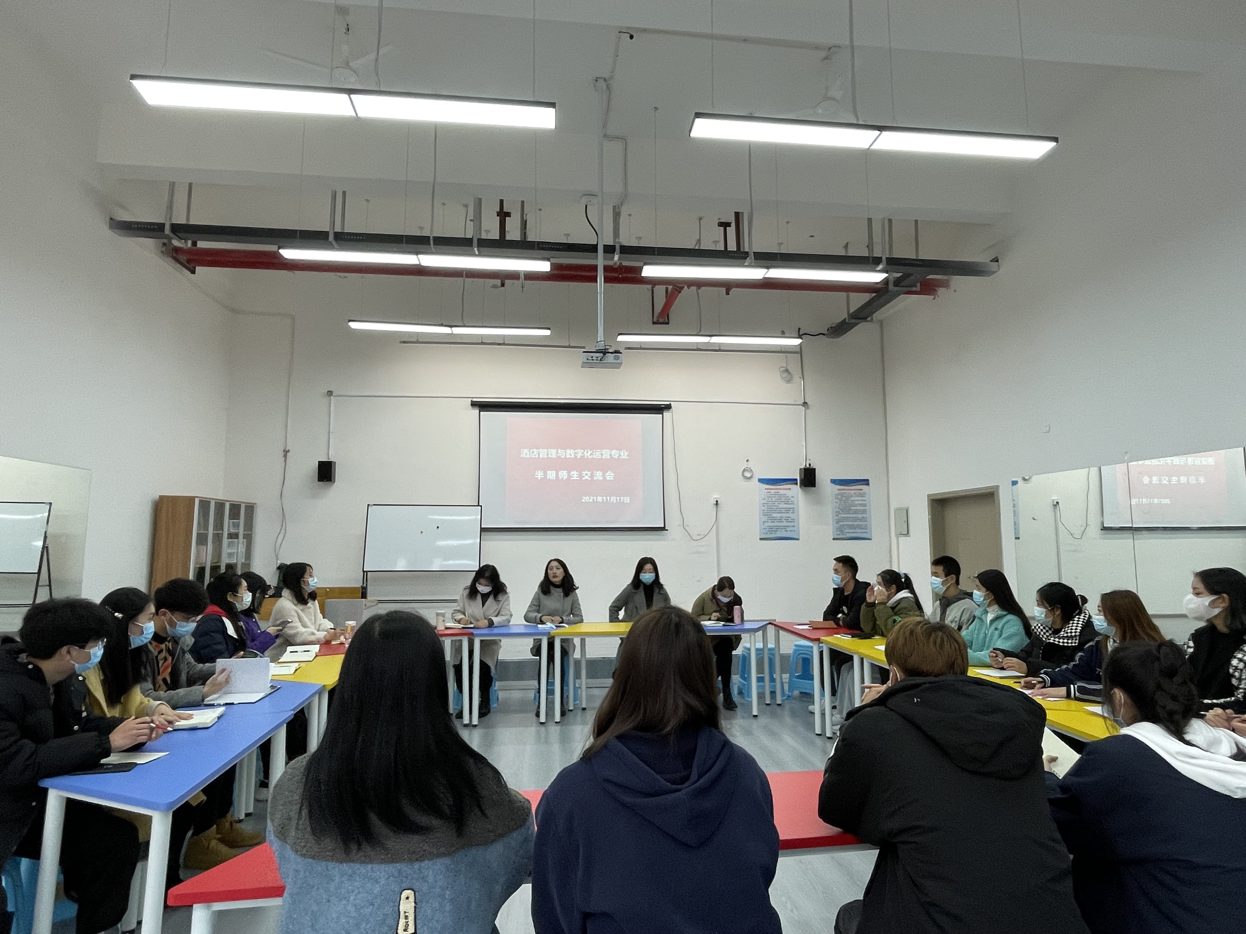 11月17日下午,2021-2022学年第一学期酒店管理与数字化运营专业半期师生交流会在8B104教室举行。酒店管理与数字化运营专业在校3个年级7个班的学生代表和全体专业老师、辅导员参加了交流。