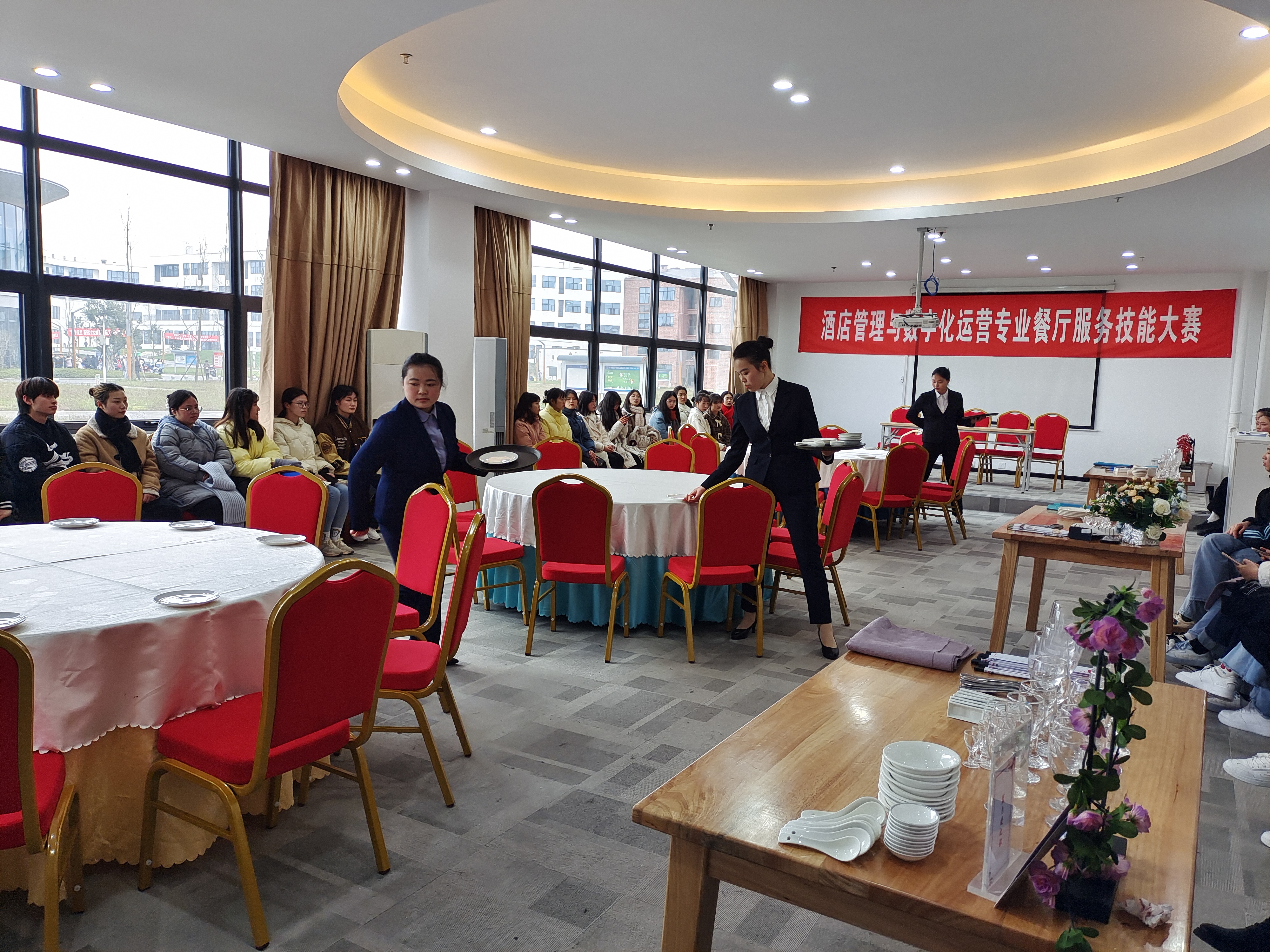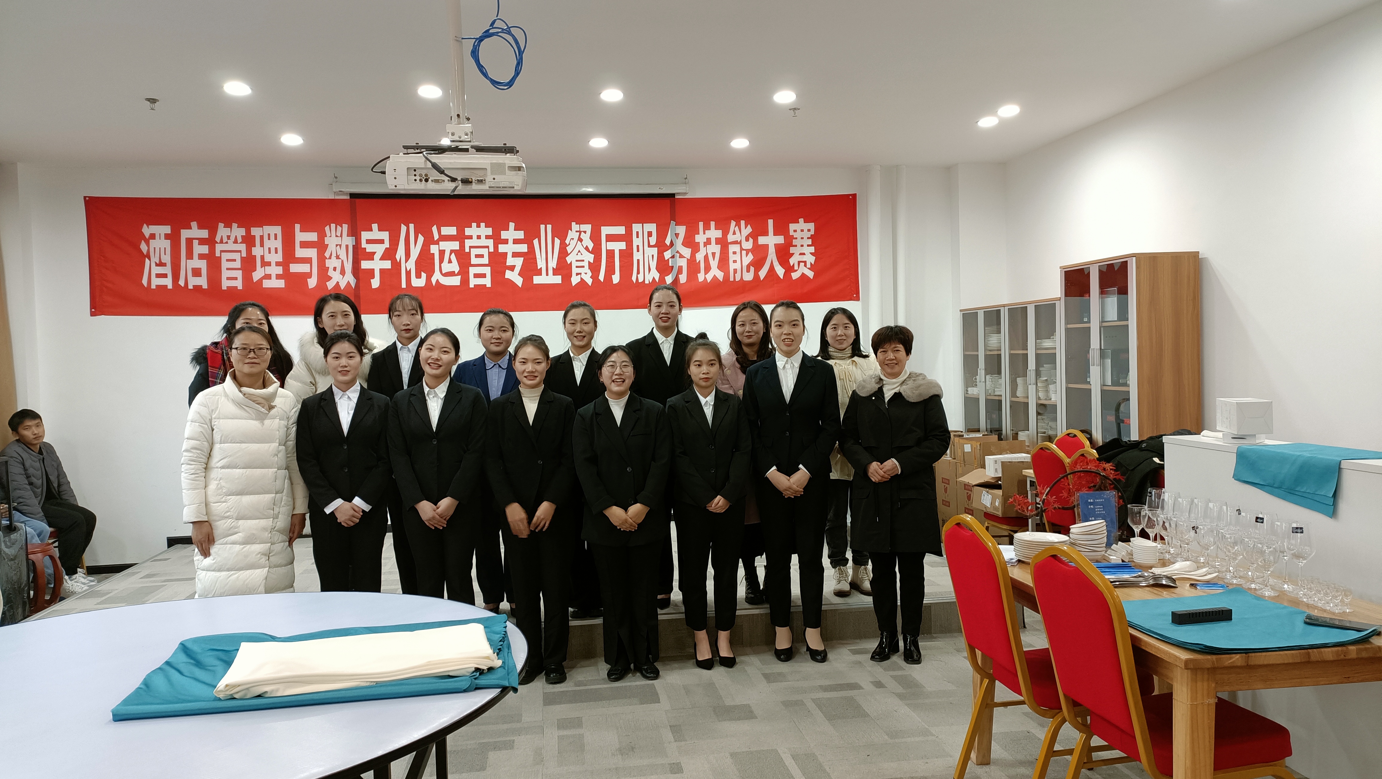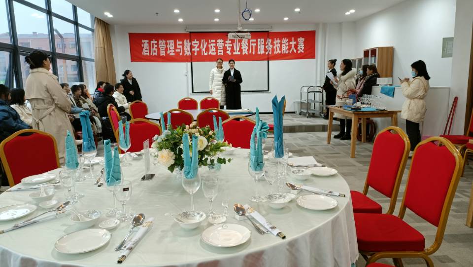 2021年12月29日下午,酒店管理与数字化运营专业举办餐厅服务技能大赛。经济管理学院党总支书记张晋、副院长陈秀芬及酒店管理教研室全体老师、辅导员莅临比赛现场指导。本专业2020级、2021级各班派代表共50余人到场观赛。