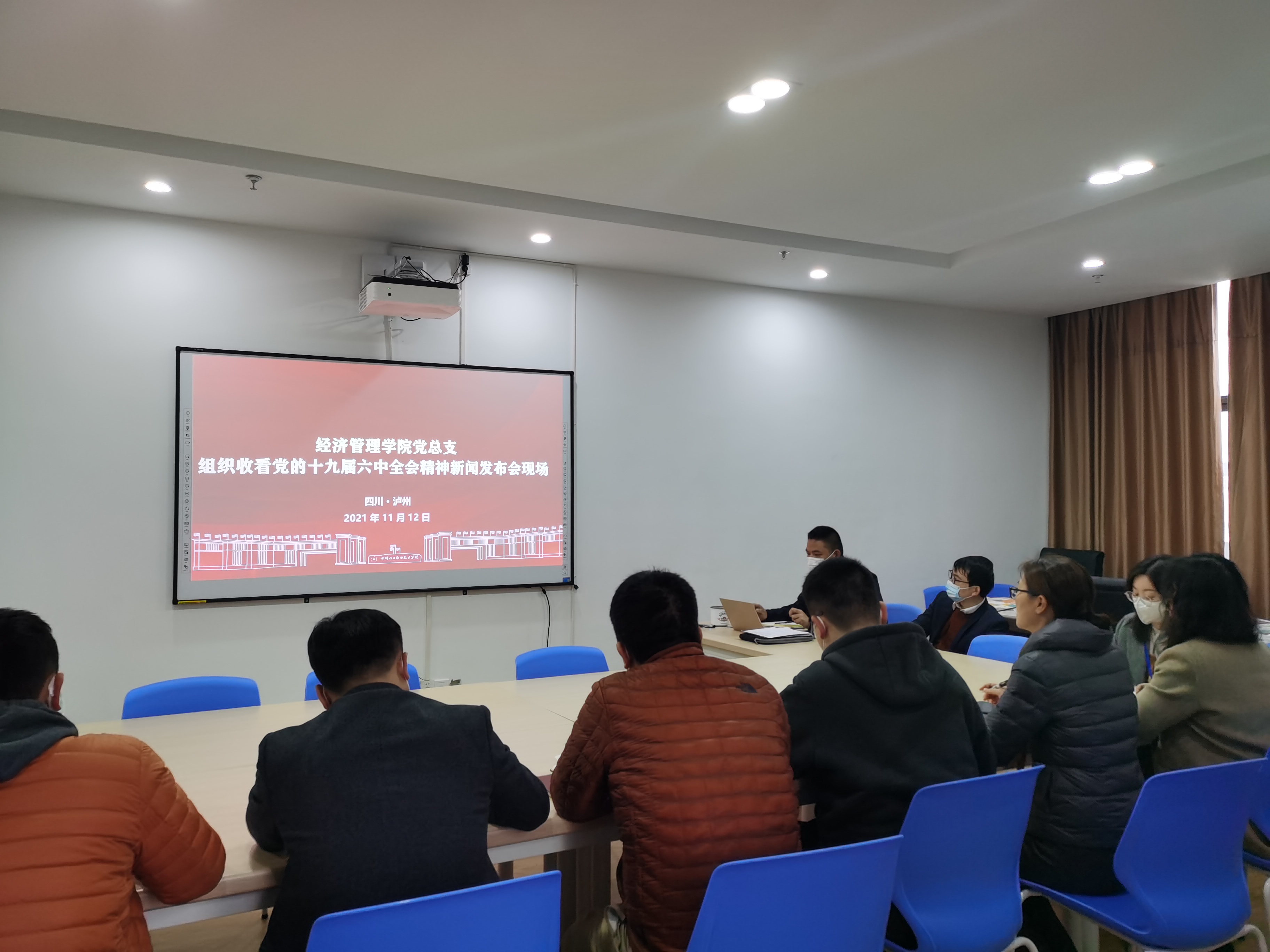 2021年11月12日上午10点,经济管理学院党总支在学校综合办公楼426会议室召开会议,组织学院教师收看党的十九届六中全会精神新闻发布会,会议由经管学院党总支副书记、院长马小洪主持。