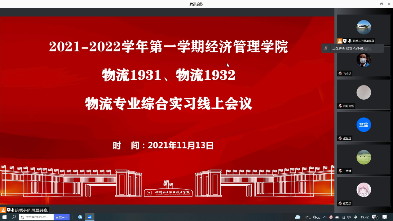 2021年11月13日,经济管理学院组织召开物流19级学生线上会议。参加此次会议的有经济管理学院马小洪院长、陈秀芬副院长、专业负责人兰秀建老师以及陈梅和熊典两位实习指导老师。会议由陈秀芬副院长主持。