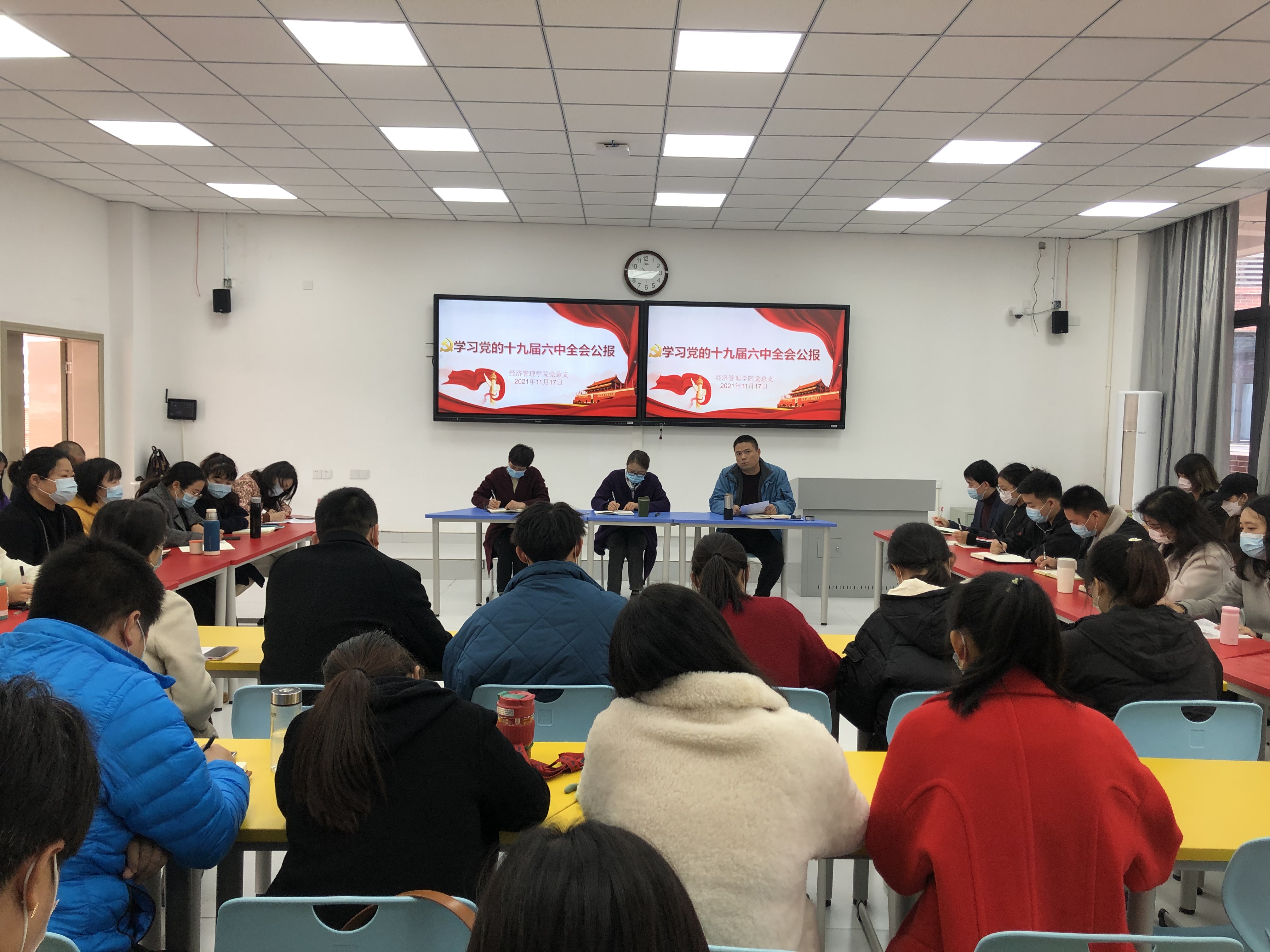 11月17日下午,经济管理学院党总支召开学习党的十九届六中全会精神会议。经济管理学院全体教师、学生代表共50余人参加了会议。
