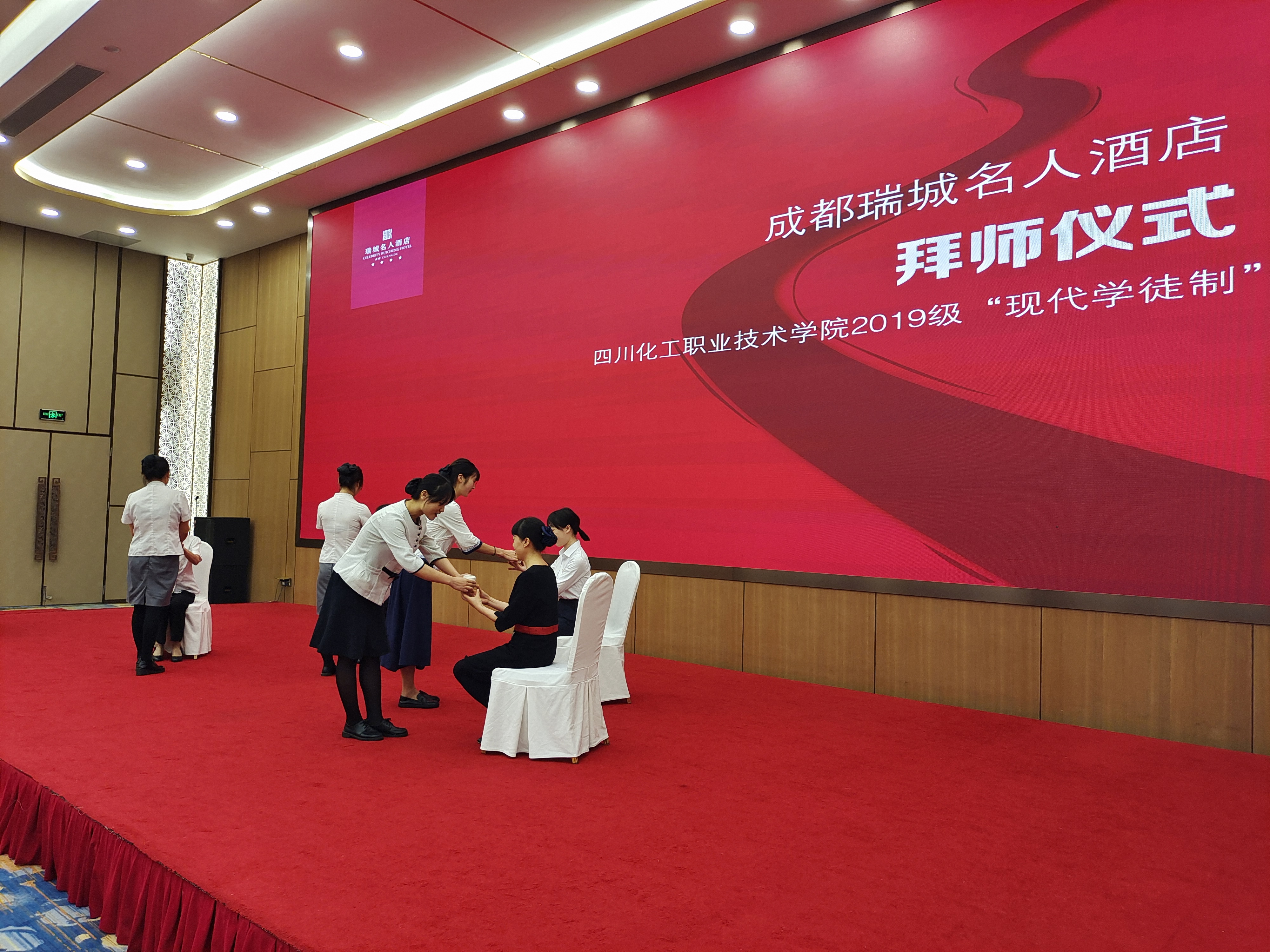 8月19日上午,我校2019级酒店管理与数字化运营现代学徒制学生拜师仪式在成都瑞城名人酒店隆重举行。瑞城名人酒店总经理庄文金以及各部门部门长,学校副院长王志斌、经济管理学院院长马小洪、副院长陈秀芬,酒店管理专业负责人宣雯娟和2019级现代学徒制瑞城名人酒店班全体学生参加了此次仪式。