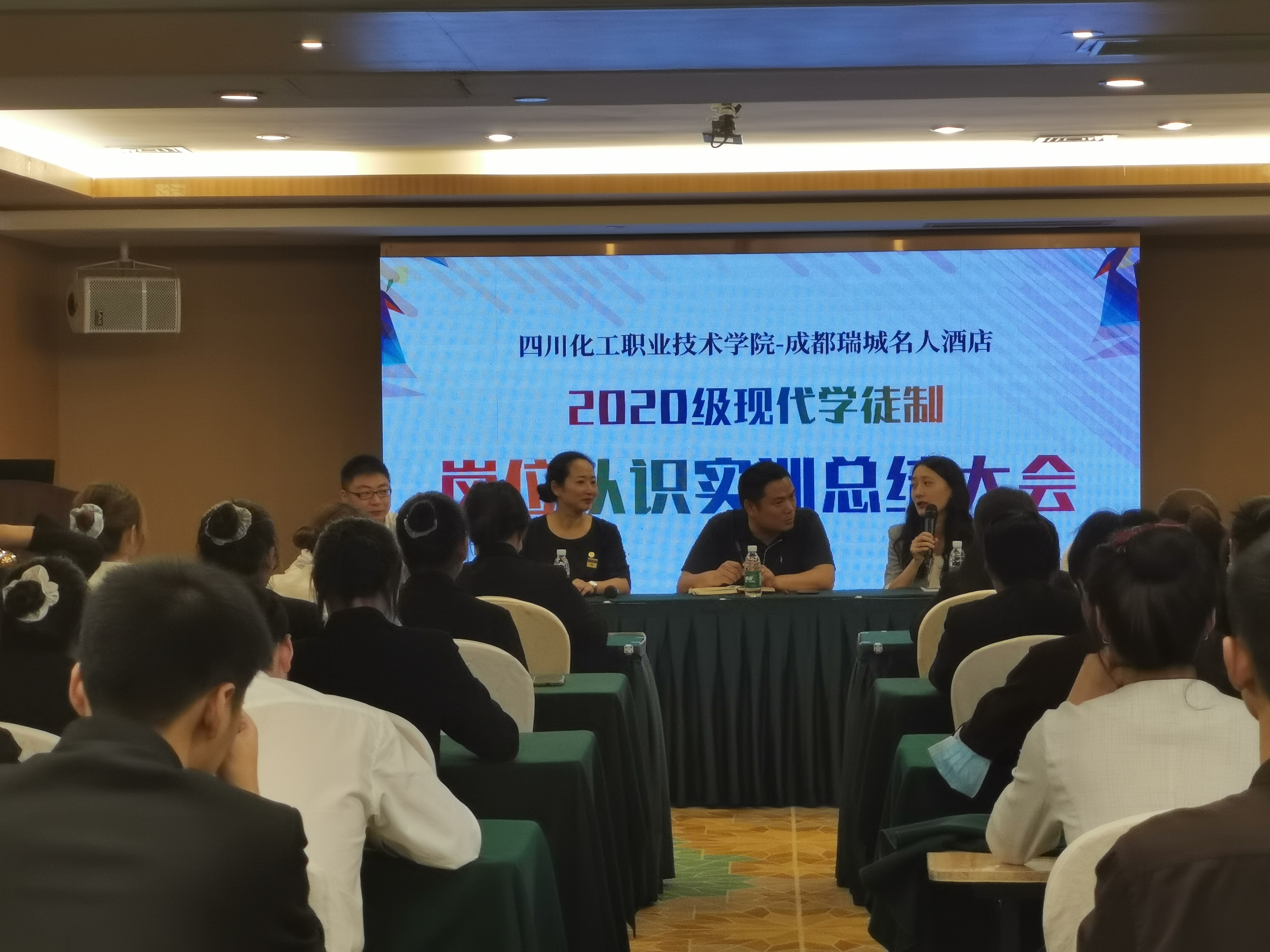 5月27日下午,2020级酒店管理现代学徒制成都瑞城名人酒店班岗位认识实训总结会在成都瑞城名人酒店举行。经济管理学院马小洪院长、成都瑞城名人酒店冯莉总监、酒店管理专业负责人宣雯娟老师、张燚老师与49名同学一起参加了总结座谈。