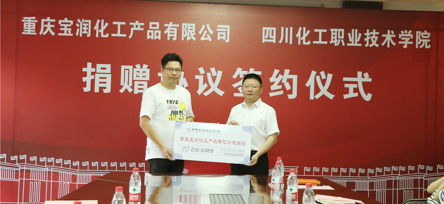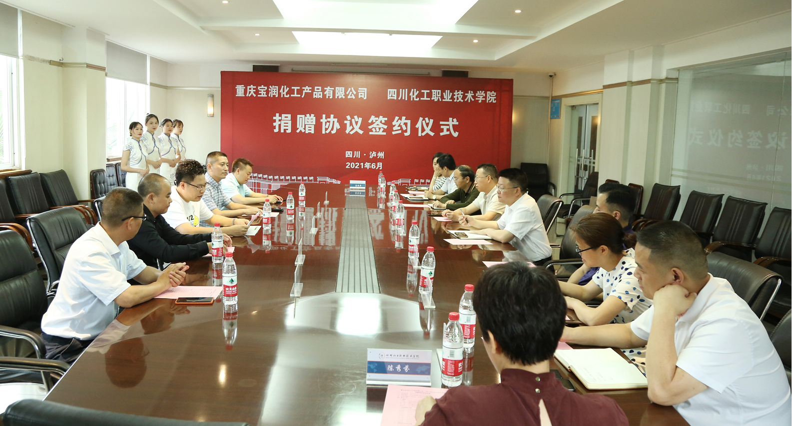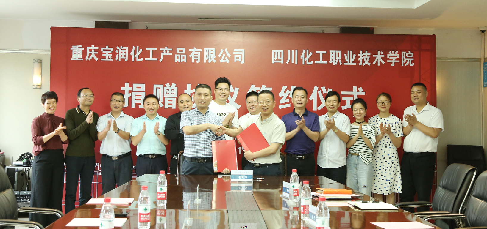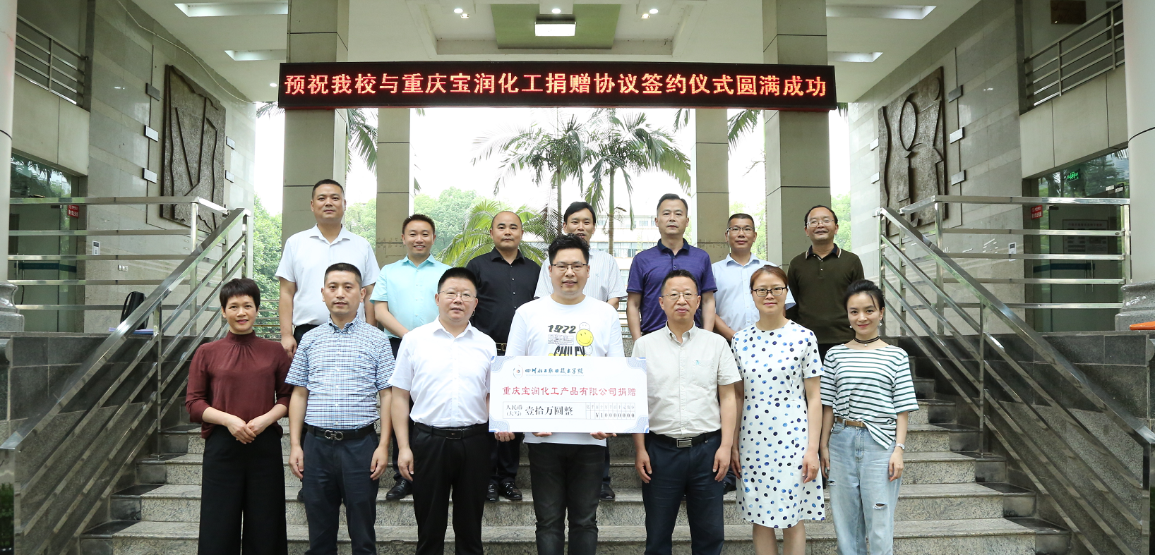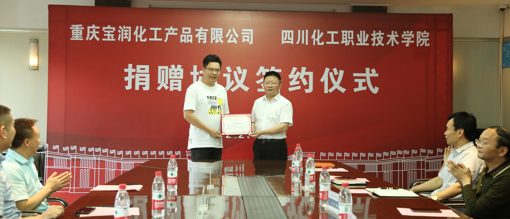 在与会人员的共同见证下,重庆宝润化工产品有限公司战略合伙人、执行副总唐菠与学校副院长蒲开伦签订捐赠协议。