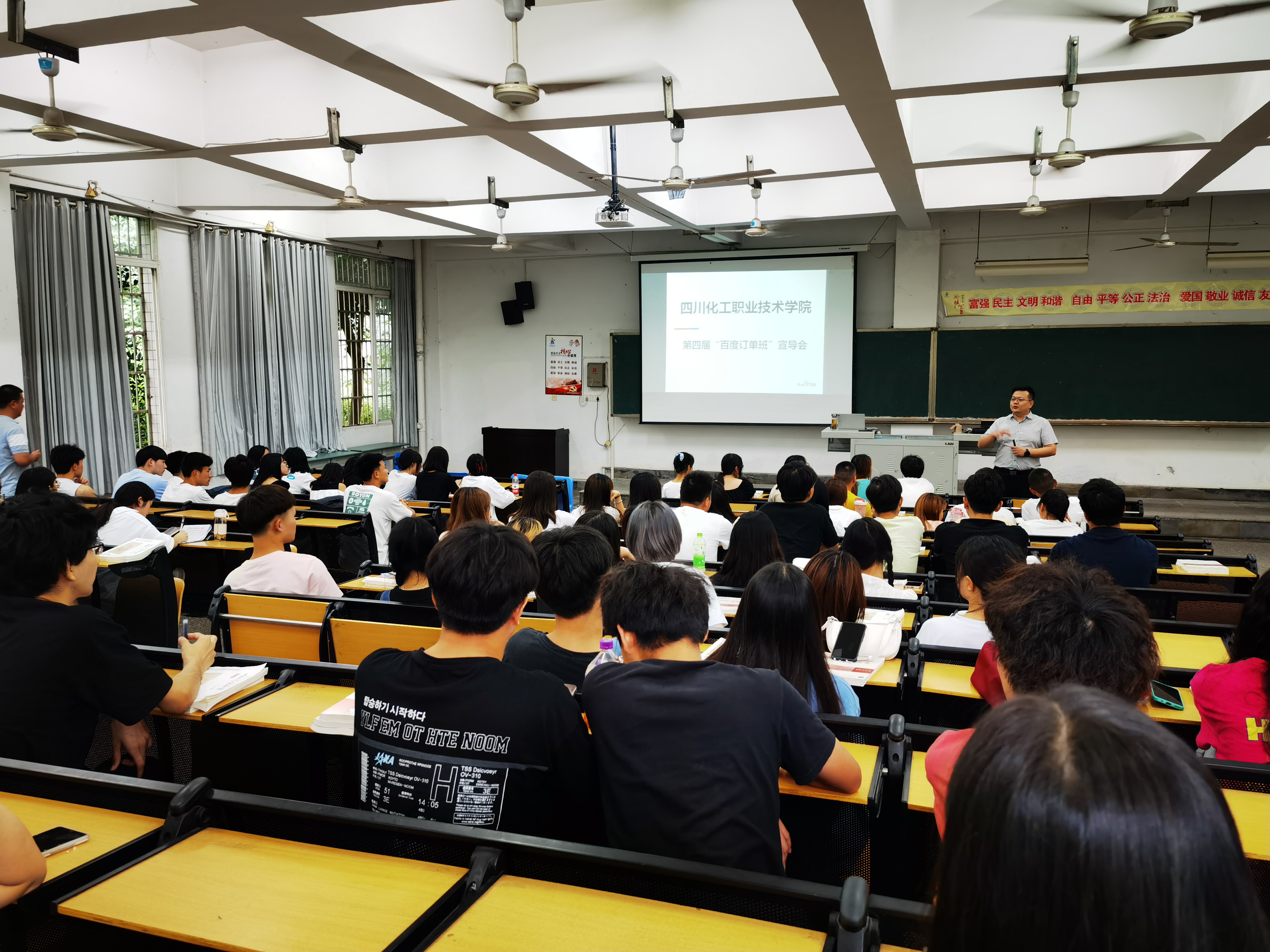 四川化工职业技术学院和成都百都科技有限公司合作的“百度订单班”开展三年来,共培养了近百名同学,近40名同学签订了就业协议。本次订单班宣导会主要目的是引入企业专家为19级同学提前开展就业辅导。宣导会上,来自成都百都科技有限公司的HRBP渠道部高级总监张保刚为同学们讲解了大学生的就业心态调整、公司的企业文化、岗位晋升渠道等内容,鼓励大家积极提升自己的核心竞争力,探寻自己喜欢和适合的工作岗位。