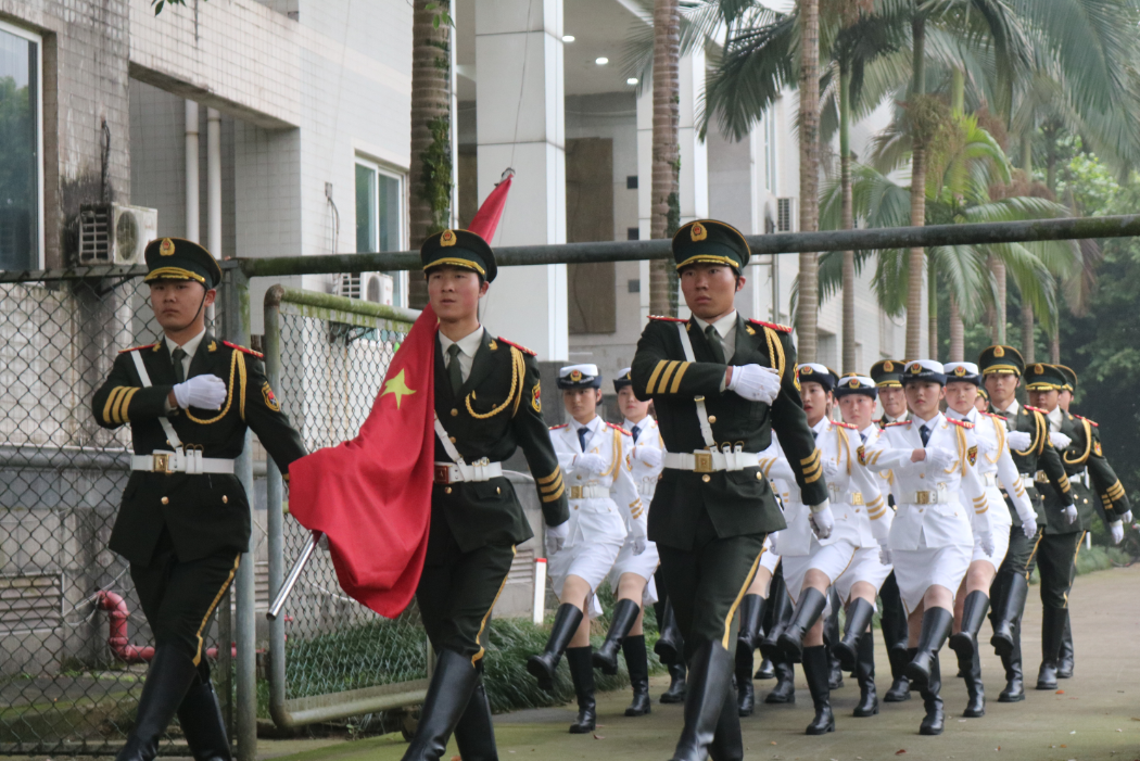 在全体师生的注目礼下,英姿飒爽的国旗护卫队队员们护送鲜艳的五星红旗进场,伴着国歌《义勇军进行曲》的奏响,迎着初升的太阳,鲜艳的五星红旗冉冉升起,全体师生行注目礼,庄重肃立,注视着迎风飘扬的五星红旗,深怀对祖国无限的热爱和崇高的敬意。