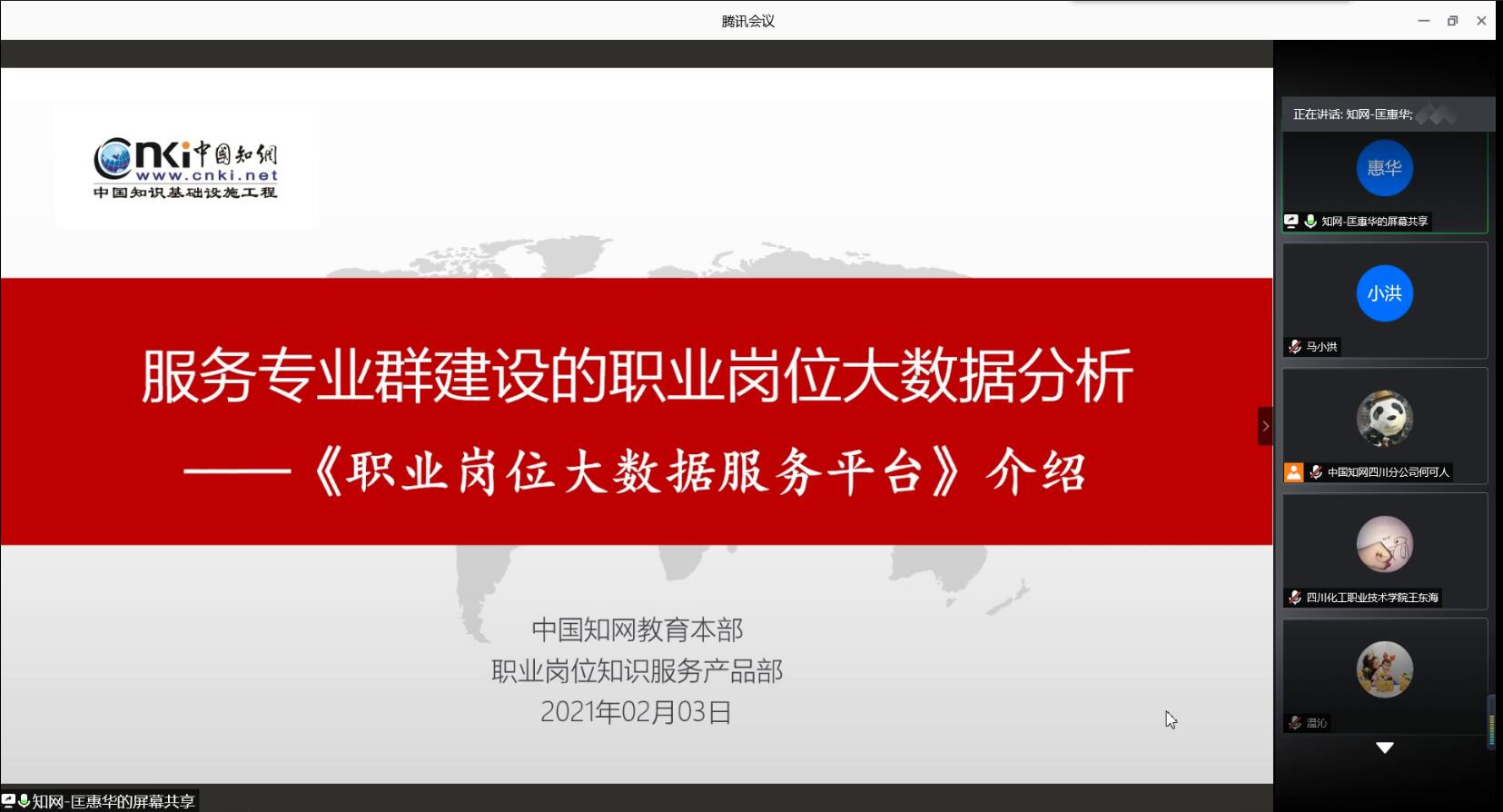 为进一步提高我院人才培养质量、培育学院办学特色,结合2021级人才培养方案修订需求,2月3日,经济管理学院组织召开专业群建设线上研讨会。本次线上研讨会特别邀请了中国知网职业岗位知识服务产品部主任匡惠华、中国知网职业岗位知识服务产品经理郑蕊依、中国知网职业岗位知识服务产品部副主任杨滨和中国知网四川分公司经理何可人线上分享了《职业岗位大数据平台》和《院校创新发展监测平台》。
