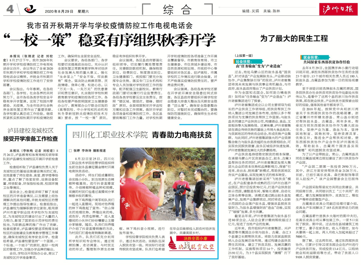 在学校团委的指导和支持下,经济管理学院依托专业特色,经过学院组织的讨论设计和精心准备,召集电商、营销等专业的同学们开展了以“逐梦青春,电商扶贫金榜行”为主题的暑期社会实践活动。团队成员于8月下旬集体奔赴四川省泸州市叙永县摩尼镇金榜村,开展电商助力农产品销售活动,包括直播助力农产品销售、给养殖户开展直播销售的基本技巧和方法的教学。同时充分通过媒体宣传报道实践活动内容和效果,《泸州日报》8月29日对此社会实践活动进行了专门报道。