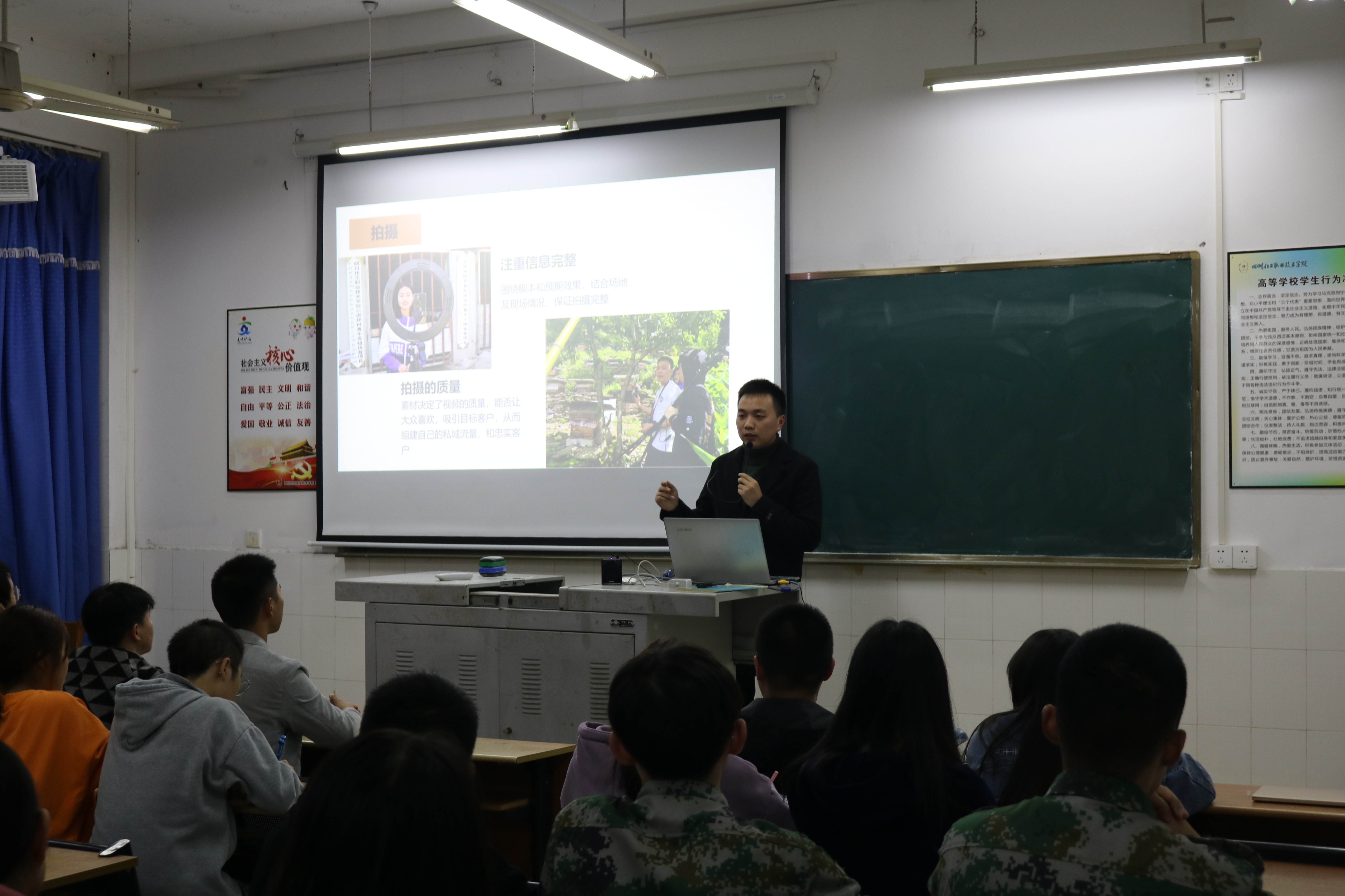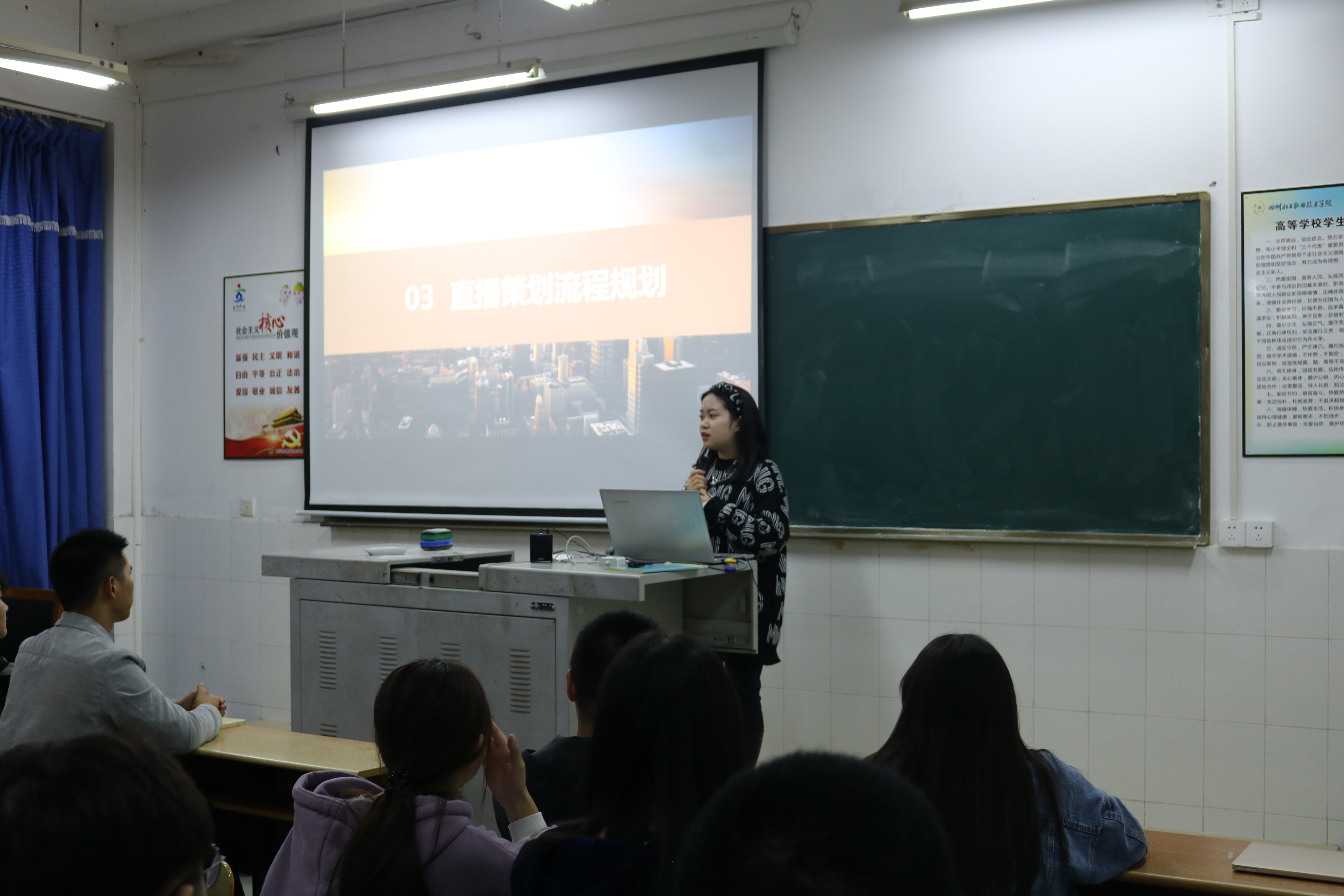 以胡磊、夏安艳、蒋倩、赵家辉、潘梦莉等几位同学为代表的小分队成员,通过“策划脚本拍摄、直播产品抖音展示推广、直播策划流程规划、直播带货、后台服务与客户支持”这五个方面,向电商20级新生们全方位的展示直播流程、直播技巧等与电商专业密切相关的内容。