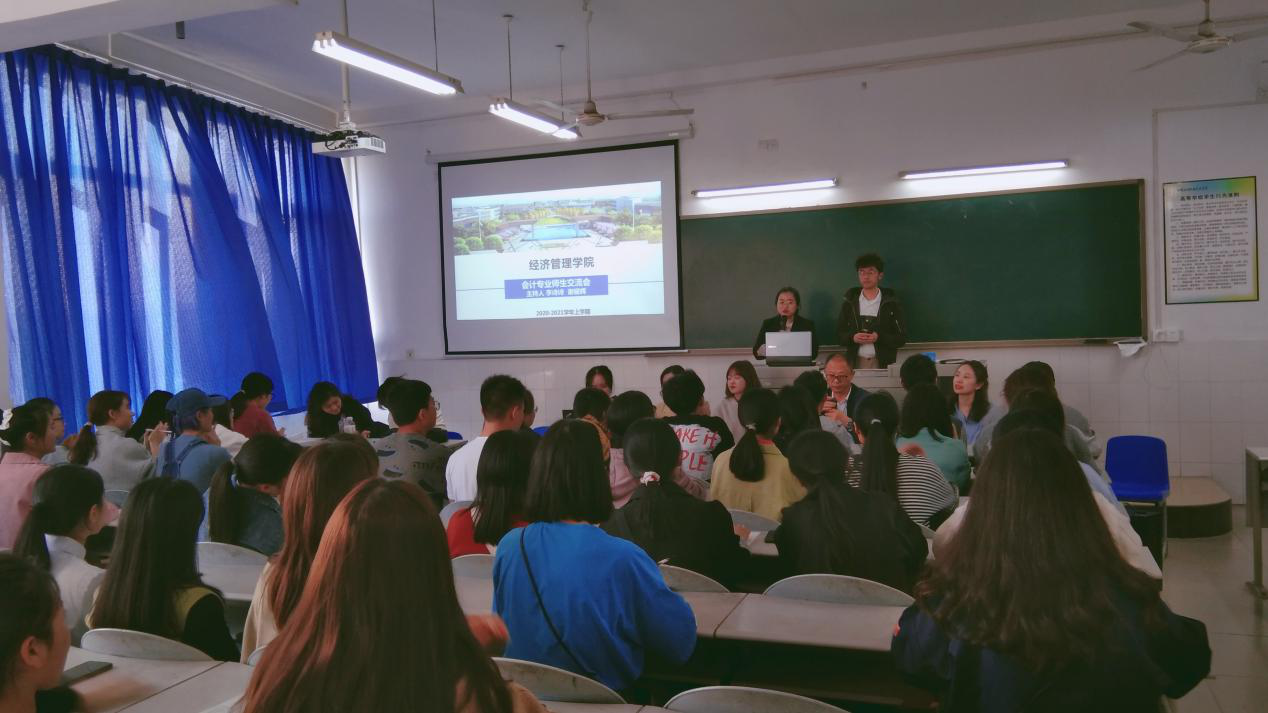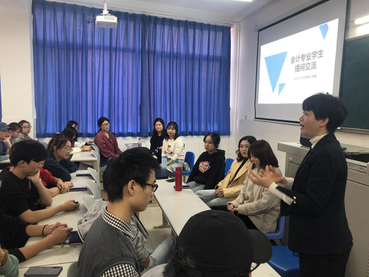 2020年11月18日下午,经管学院会计专业师生在代英楼4-404教室召开了期中师生交流座谈会。会计教研室主任陈秀芬老师、专业负责人张楠老师等专业老师和会计专业18级、19级、20级各班代表参加了本次座谈会。本次交流会由会计专业李诗诗、谢耀辉老师共同主持。