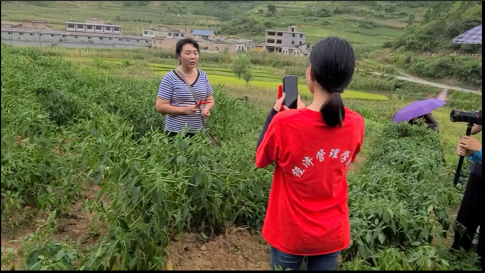 活动中,师生们组成实践小分队,到当地原生态辣椒种植地开展起抖音直播宣传活动,介绍了辣椒种植品种和规模,采摘的村民们也通过直播间分享了辣椒丰收的喜悦。