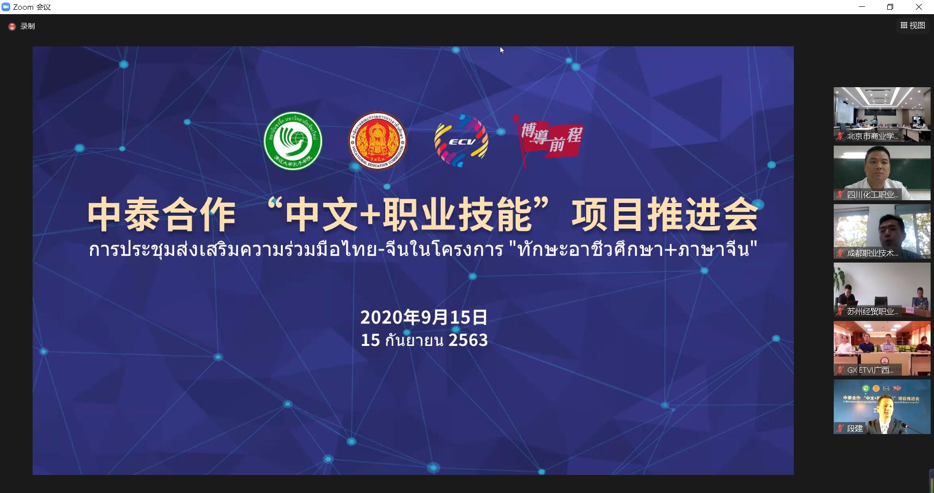 9月15日上午,由泰国教育部职教委、全国电子商务职业教育教学指导委员会(中国)、“一带一路”电商谷项目建设发展理事会、清迈大学孔子学院主办,北京博导前程信息技术股份有限公司承办的中泰合作“中文+职业技能”项目推进会在ZOOM平台举行。会议由浙江经贸职业技术学院副校长张红主持,来自中泰30多所院校代表参加了此次会议,我校经济管理学院马小洪副院长和营销专业群教研室专业教师及其他相关人员参加了会议。