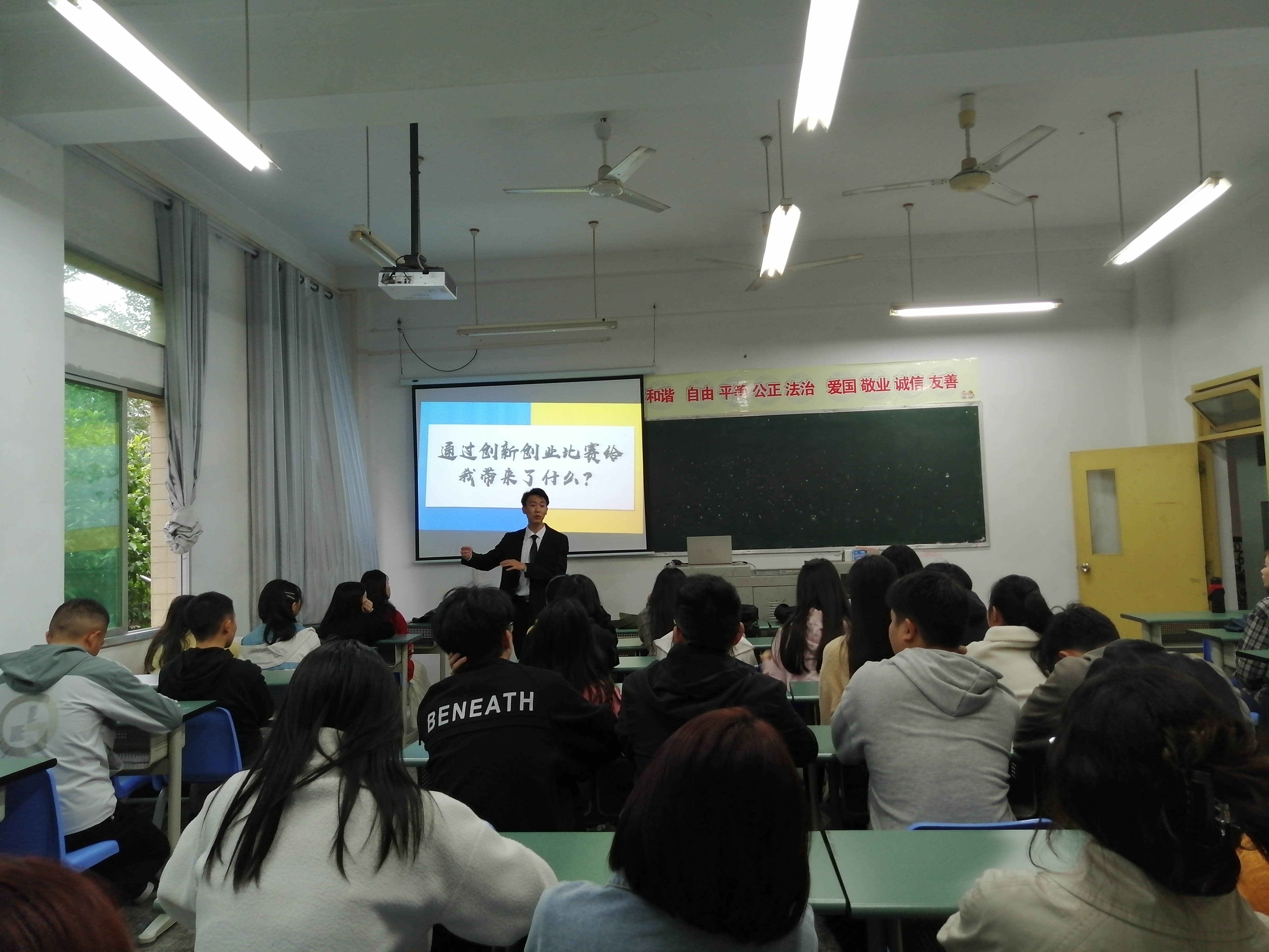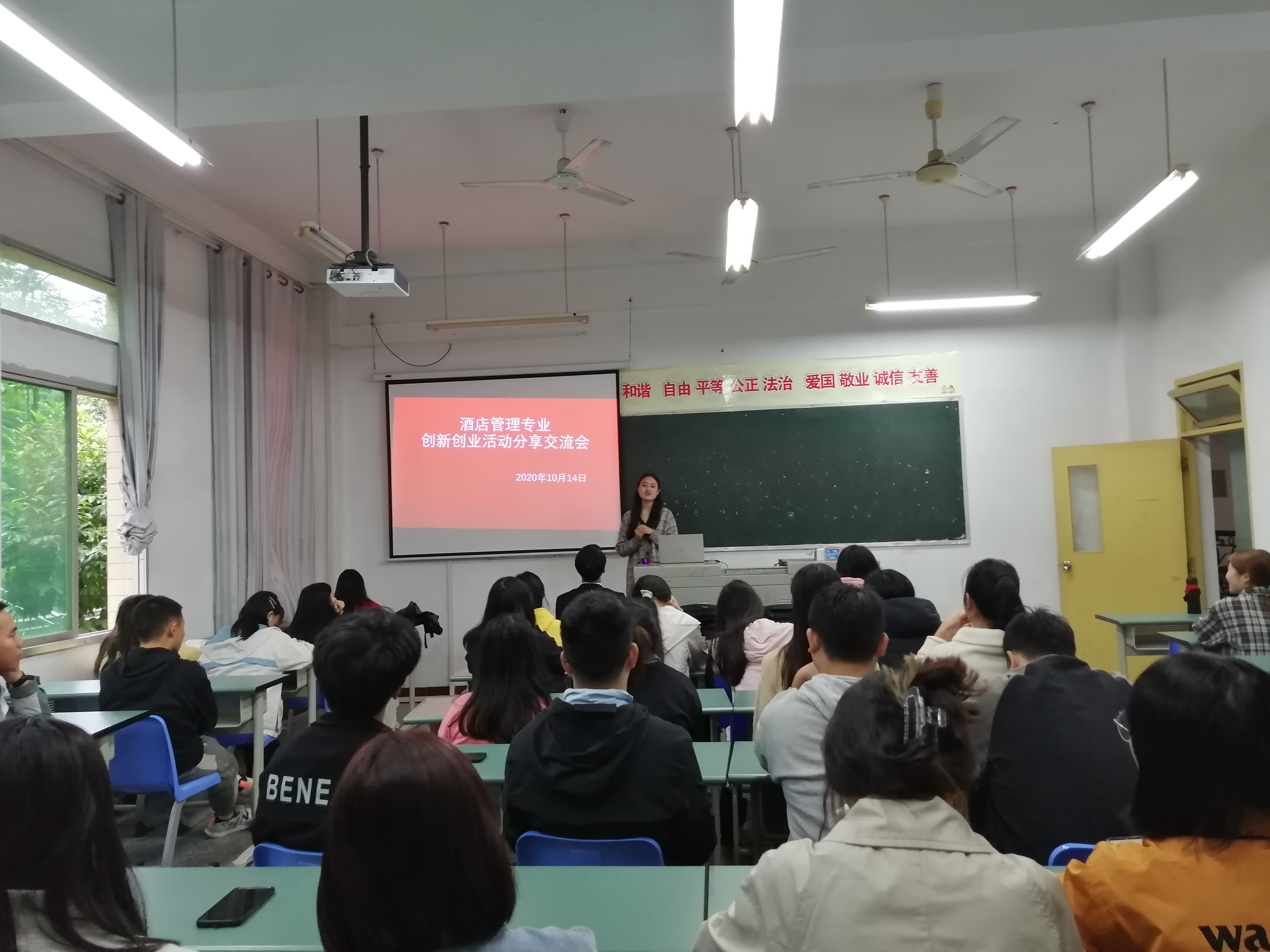 10月14日下午,酒店管理专业在综合楼A203举行创新创业经验分享会。2018级酒店管理专业周本强、徐容琼两位同学结合亲身经历向学弟学妹们分享了创新创业活动的经验。会上还对2018级酒店管理专业中餐摆台技能大赛的获奖者颁发了证书。