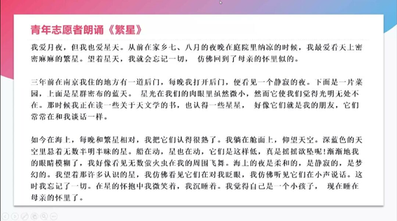 接着,物流1932班徐贵艳同学分享了自己在防疫过程中的故事,她讲道:“广元疫情防控让她深刻感受到,冲在一线的疫情防控的人员,他们的工作是多么的细致,多么的负责,疫情工作者的一举一动,都让她深深感受到为战胜疫情要付出很多精力。另外,在防疫志愿的过程中,虽有一些小插曲,但更让她明白与成长了很多,也更加积极去做好志愿者的工作,用实际行动证明自己是合格的志愿者。接着她朗读了《繁星》,把对星空、繁星的细致描写拿捏得恰到好处,同时也表达出作者对美好生活的热爱和向往。
