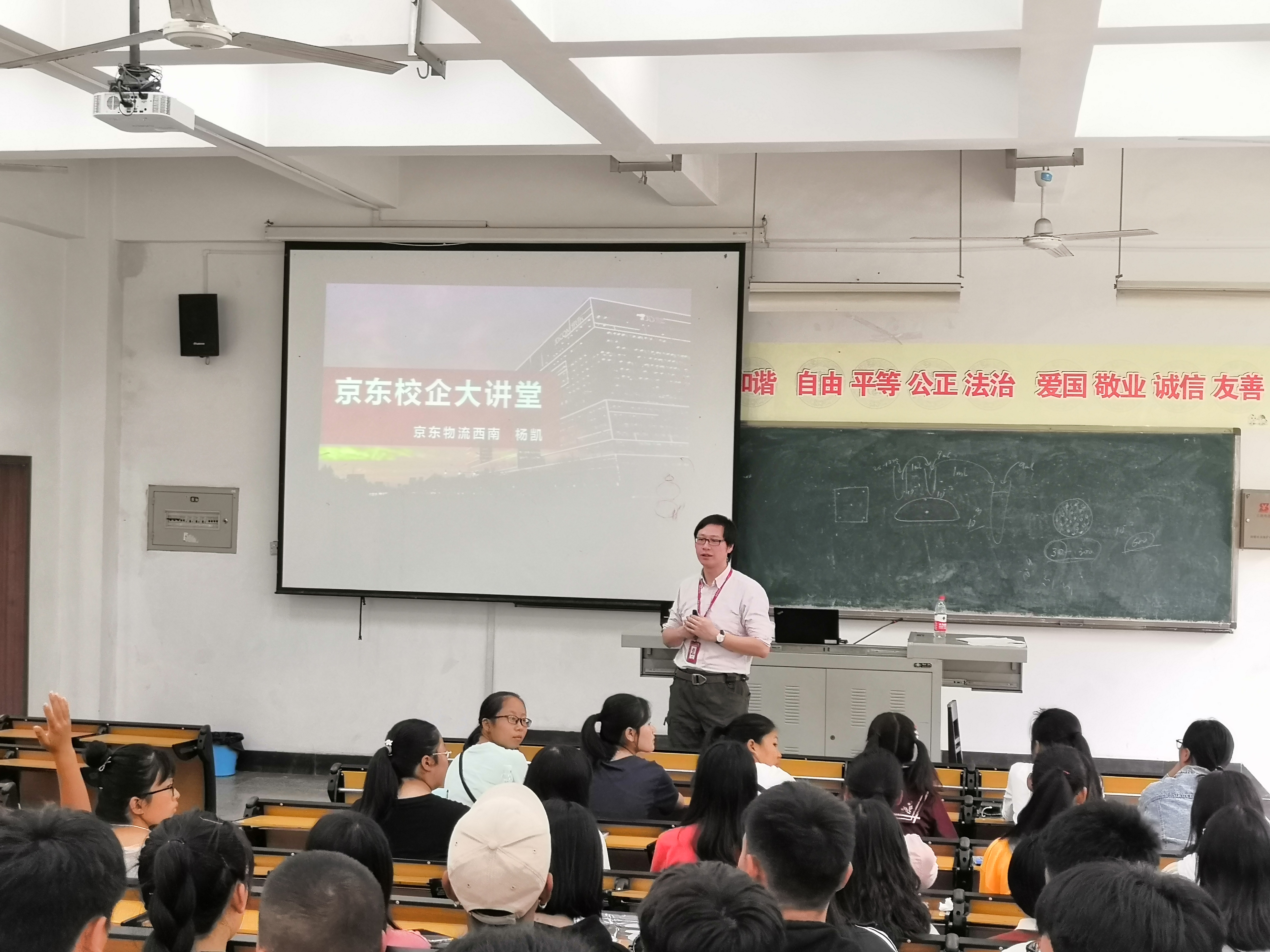 京东物流杨凯总监介绍了京东集团的发展历程和几大发展板块,阐述了京东的人才观,重点介绍了京东仓储物流情况,京东物流人才发展路径、京东人才观等作了阐述,并热诚欢迎物流专业学子携手加盟京东,共创事业辉煌。在互动环节,杨凯还就同学们关心的问题进行了解答。
