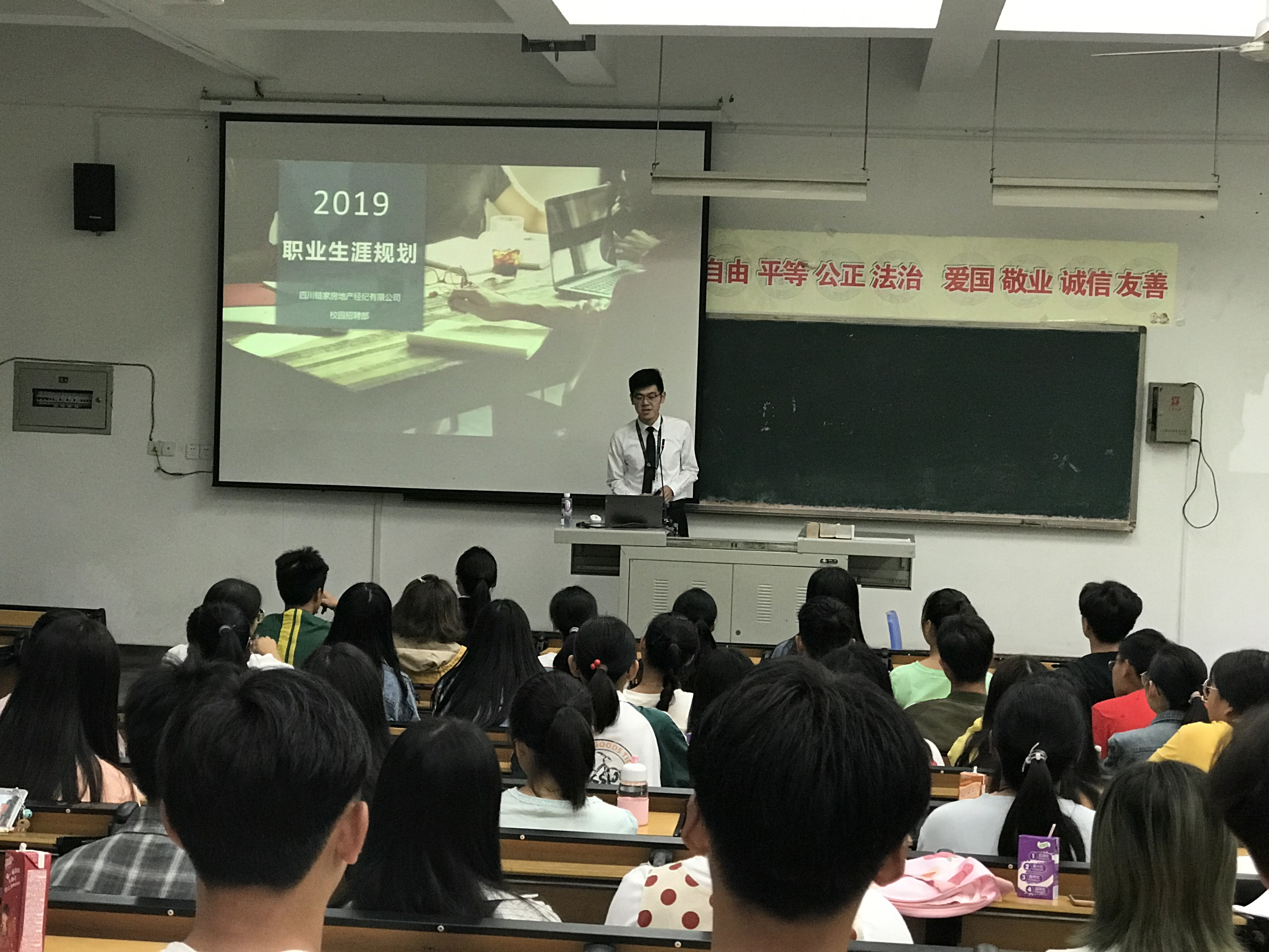 9月18日上午8点,在实训楼A102教室营销专业19级新生聆听了一场关于如何做好职业规划的专业讲座。本次讲座由四川链家房地产经纪有限公司资深的人力资源培训师胡成瑜老师主讲,内容为“如何做好个人职业规划”。针对新生实际需求情况,结合专业特点,胡成瑜老师用丰富的实际案例,从“认识自己、认识社会、认识行业和如何制定计划”四个方面进行了详细而生动的讲述,向同学们说明了“早立志、立常志”的重要性;期间同学们也和胡老师进行了积极的互动和提问。本次讲座强化了同学们的职业规划意识,为他们专业学习明确了方向。