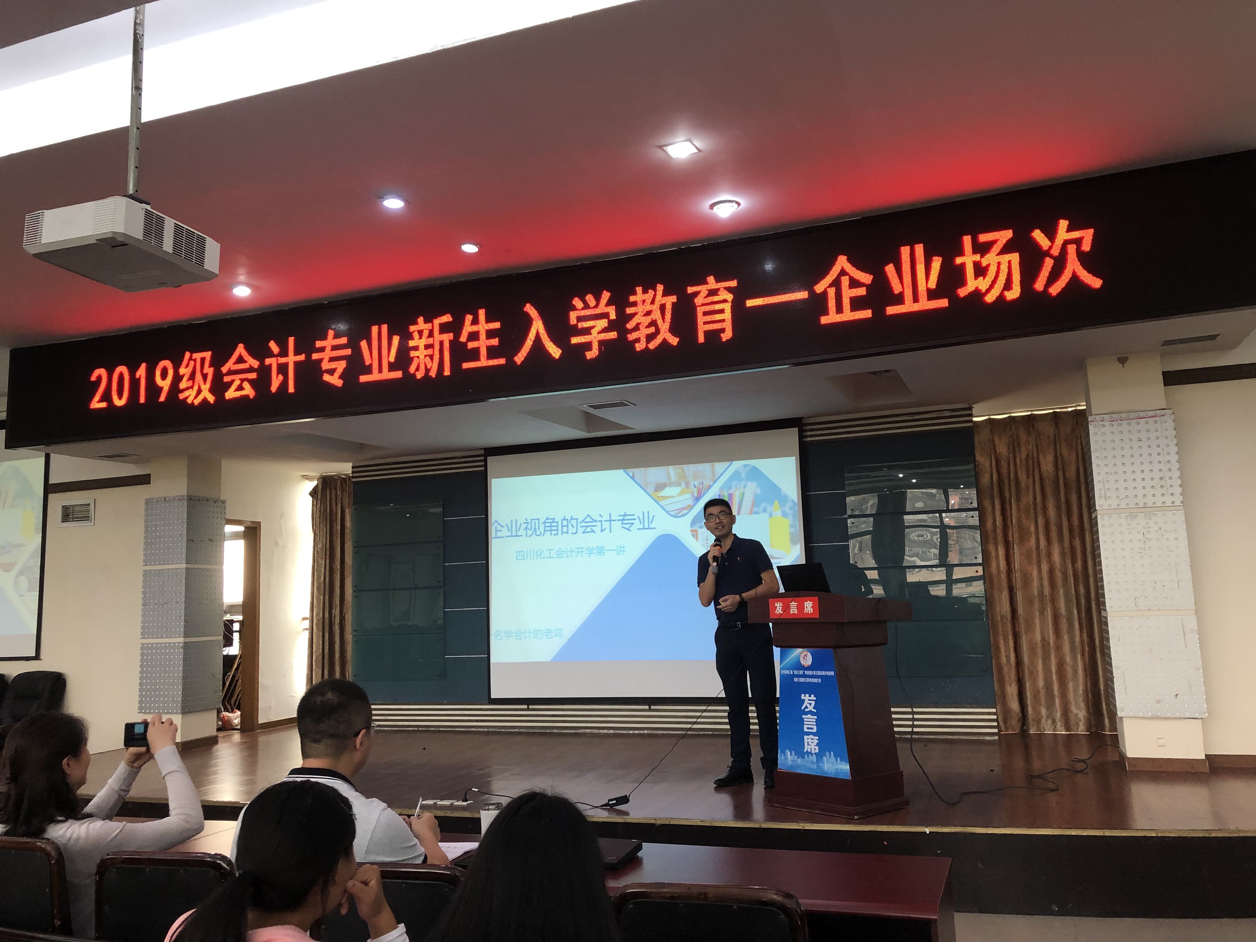 为了让2019级会计专业的新同学们进一步了解会计专业的就业前景和职业规划,9月16日上午,会计专业2019级新生入学教育(企业场次)在行政楼五楼会议室开讲,会计专业2019级272名新生参加了本次讲座。本次活动邀请到了新道科技股份有限公司西南片区伙伴总经理、教育部全国万名优秀创新创业导师瞿刚,以及泸州弘壹财务服务有限公司总经理黎红开展了一场“企业视角的会计专业专题讲座”。