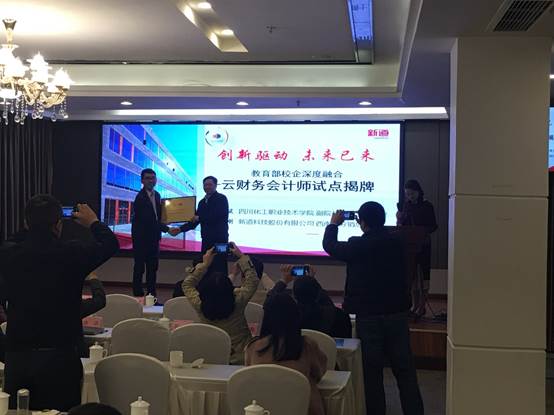 紧接着,新道科技股份有限公司西南区瞿刚总经理详细的向参会代表介绍了“教育部校企深度融合——云财务会计师项目”,并和王志斌副院长一起为四川化工职业技术学院“教育部校企深度融合——云财务会计师试点项目”揭牌。