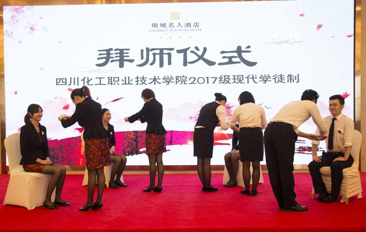 7月31日,四川化工职业技术学院2017级酒店管理现代学徒制拜师仪式在成都瑞城名人酒店举行,标志着2017级酒店管理现代学徒制顶岗实习全面开启。成都瑞城名人酒店总经理庄文金、酒店各级管理人员、酒店全体师傅、四川化工职业技术学院经济管理系副主任马小洪、顶岗实习指导教师、酒店管理(学徒制)1731班22名在瑞城名人酒店进行顶岗实习的同学参加了拜师仪式。