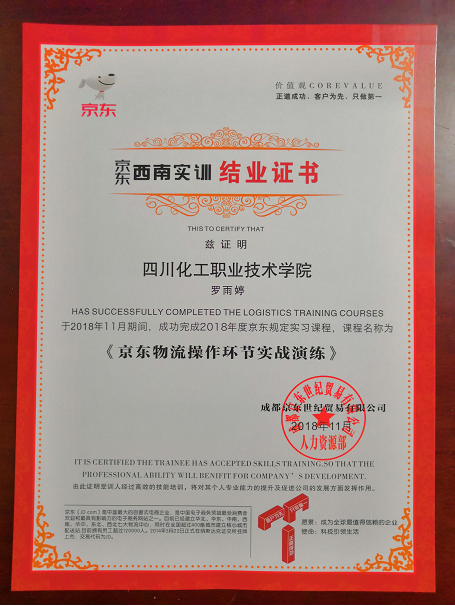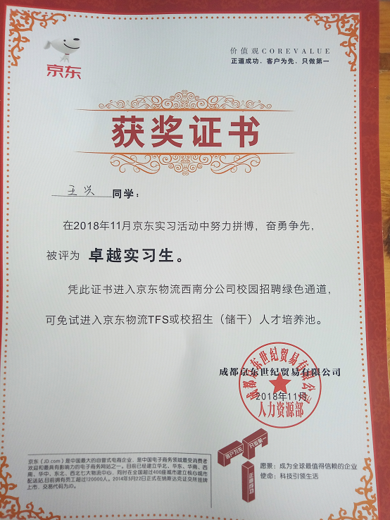 同学们在实习培训前期进行了包括专业设备、业务流程等多项素质拓展,并采用“传帮带”方式,让同学们更好更快的融入新环境。实习过程中,通过在分拣区不同岗位轮岗实习以及京东员工一对一的指导下,学生们很快掌握各岗位的业务特点和分拣中心的工作技巧,并逐步适应了高速的工作节奏。在实习期间王盼、孔蔺梅等8位同学在此次实训中因表现优异,分别获得京东颁发的“卓越实习生”、“激情之星”和“优秀实习生”称号,并凭此证书进入京东物流西南分公司校园绿色通道,可免试进入京东物流TFS或校招生(储干)人才培养池。
