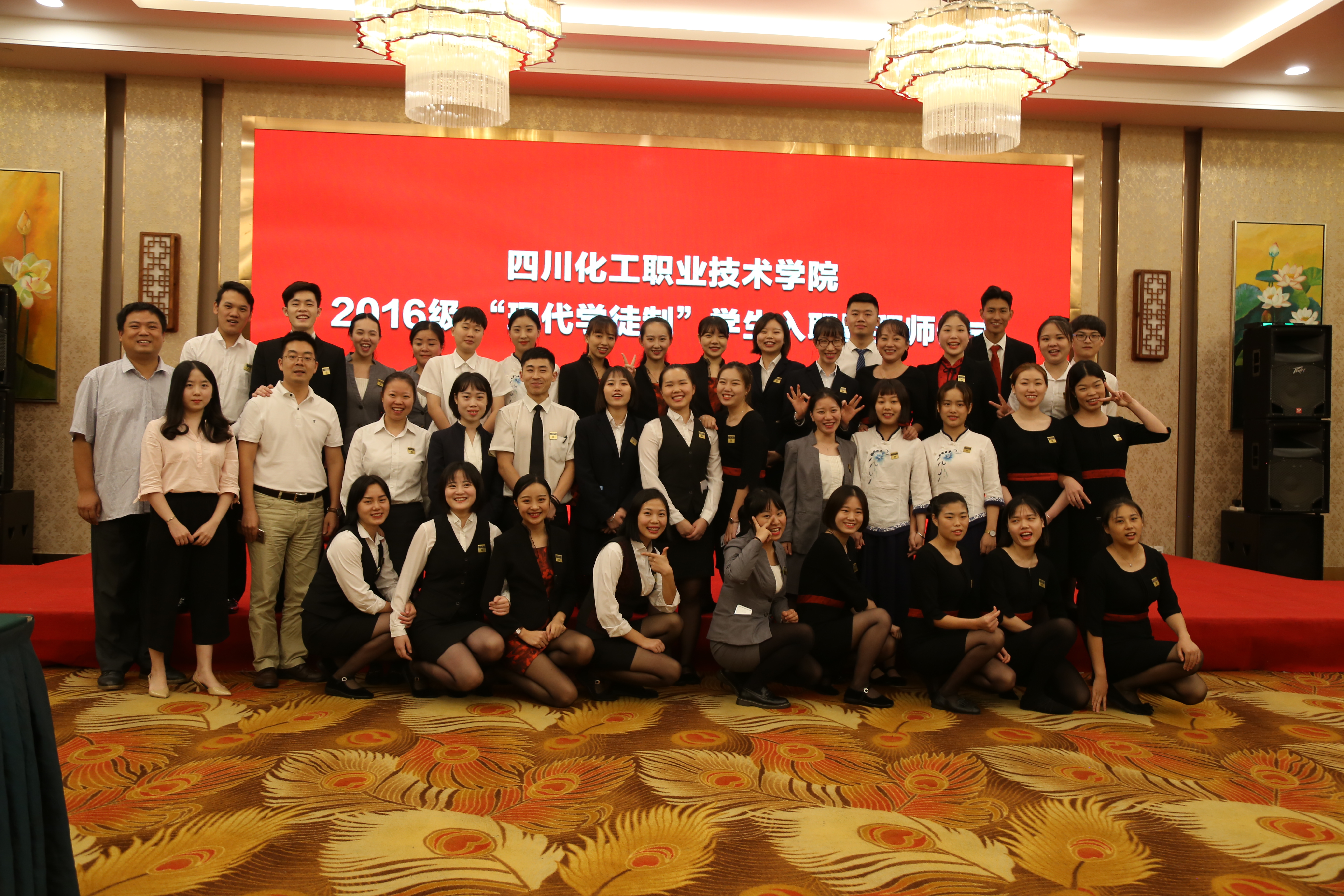 8月27日下午,我院酒店管理专业第二届现代学徒制学生入职暨拜师仪式在成都瑞城名人酒店隆重举行。瑞城名人酒店庄文金总经理、执行总经理周泽达、副总经理隋晶晶以及各部门部门长、学院经管系副主任马小洪、酒店管理专业负责人、酒店管理专业教师、酒店管理专业2016级现代学徒制24名学生参加了此次仪式。