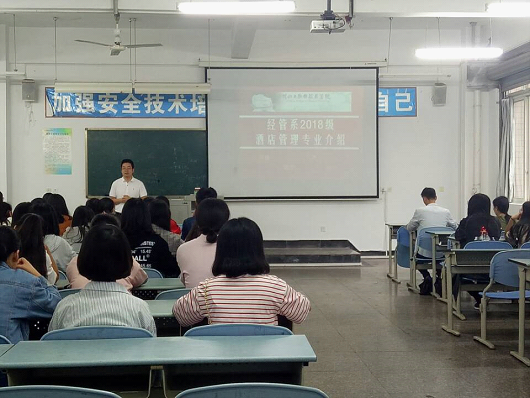 9月18日,经济管理系酒店管理与素质拓展教研室开展2018级酒店管理专业新生专业教育活动,酒店管理专业任课教师及2018级酒店管理专业现代学徒制与非现代学徒制两个班共计70余名新生参加。教研室主任张林园老师向新生们详细介绍了行业发展现状和前景、本专业办学历史、行业人才需求、我院酒店管理专业专业定位和人才培养模式、本专业典型工作岗位和职业能力、专业课程体系、专业教学概况、职业发展机会和职业规划等八个方面的情况。向同学们展示了本专业历届学生的实习实训及课堂教学视频及图片。活动中,专业教学团队与同学们进行了积极的互动。老师们耐心解答了大家关心的专业学习、实习实训、考取职业资格证书等方面的问题。老师们纷纷表示,希望同学们在今后的学习生活中加强与教学团队的沟通交流,师生携手将酒店管理专业建设得更好,为学院建设贡献力量,也为行业发展培育更多有责任、有担当、有实力的优秀人才!