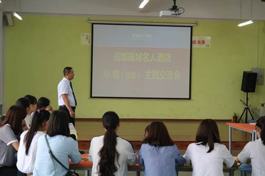 2018年5月30日,第5期酒店管理现代学徒制企业导师进校园与学徒制学生沟通“面对面”活动在实B501教室开展。成都瑞城名人酒店安全部孙成总监,工程部杨奎经理到校与我院经管系酒店管理专业17级现代学徒制学生进行了主题教学交流。