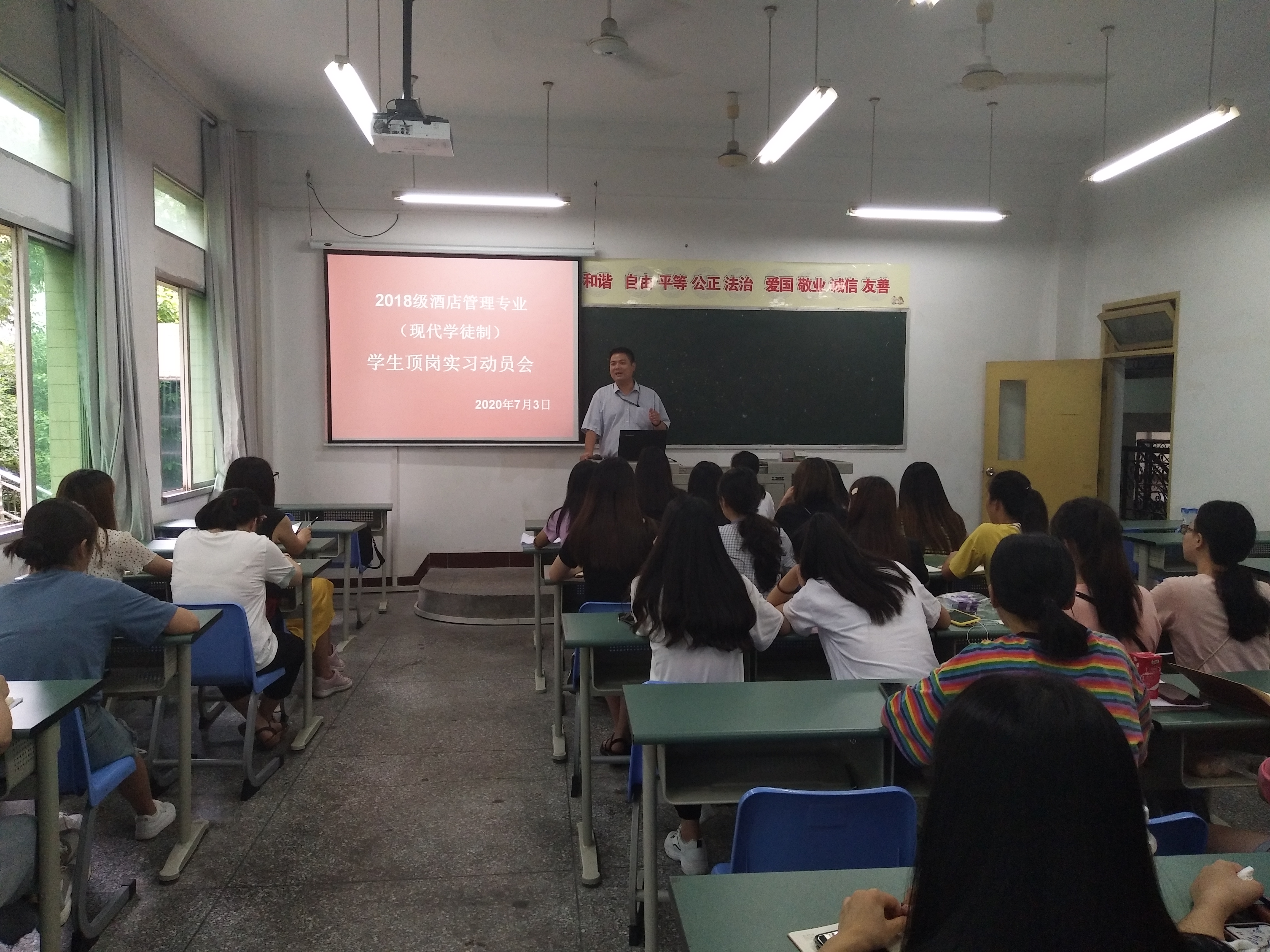 7月3日,经济管理学院2018级酒店管理专业现代学徒制顶岗实习动员大会在综合楼A203举行。经济管理学院副院长马小洪、实习指导老师宣雯娟、酒店学徒1831班辅导员霍淑媛以及2018级酒店管理现代学徒制班全体同学参加了这次会议。