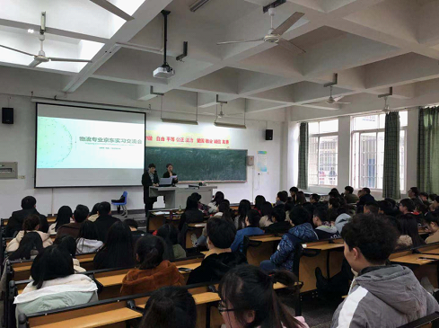 为提高学生实践技能水平,增强岗位意识和岗位责任感,为下一届学生实习做好榜样带头作用,2018年11月28日物流管理专业全体一百多名学生于我校实训楼一楼开展京东实习交流会。