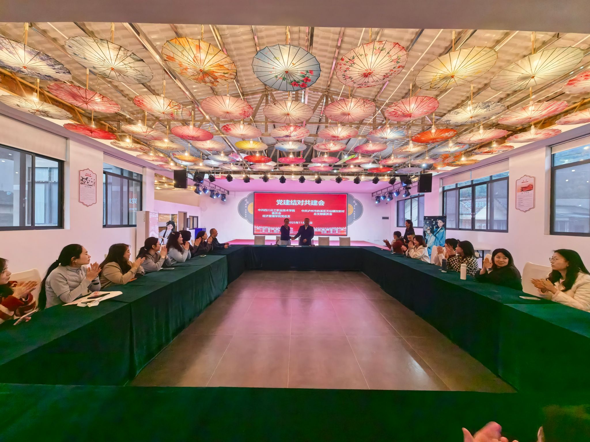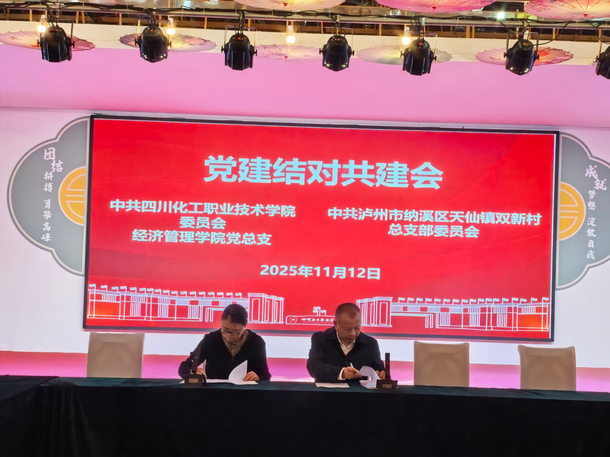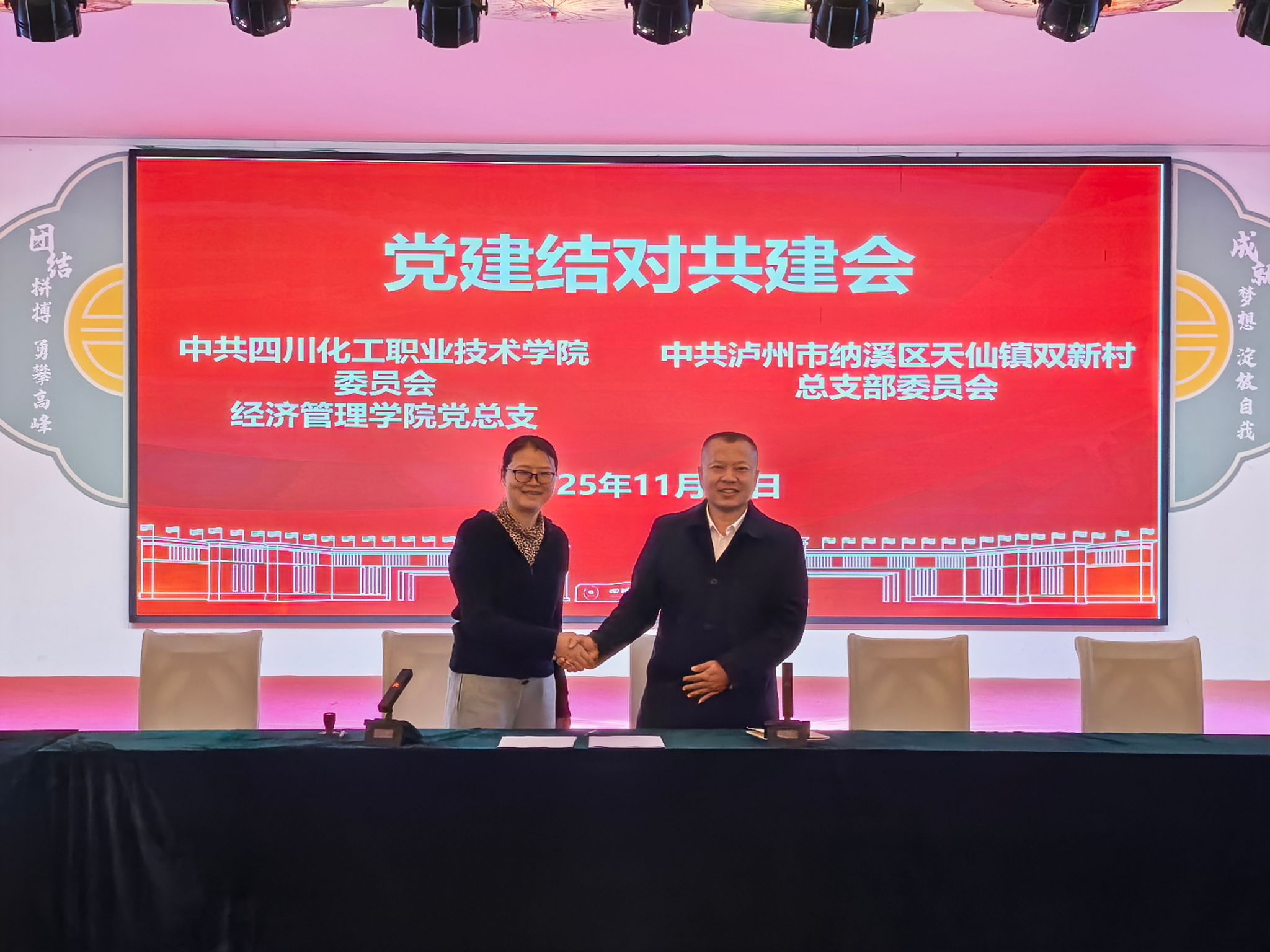 为促进乡村振兴,全面落实学校“1135”发展战略,积极探索创新党建工作,2025年11月12日,经济管理学院党总支与双新村党总支在纳溪区天仙镇双新村党群服务中心成功举行党建结对共建签约仪式。签约仪式由经济管理学院党总支书记张晋主持。